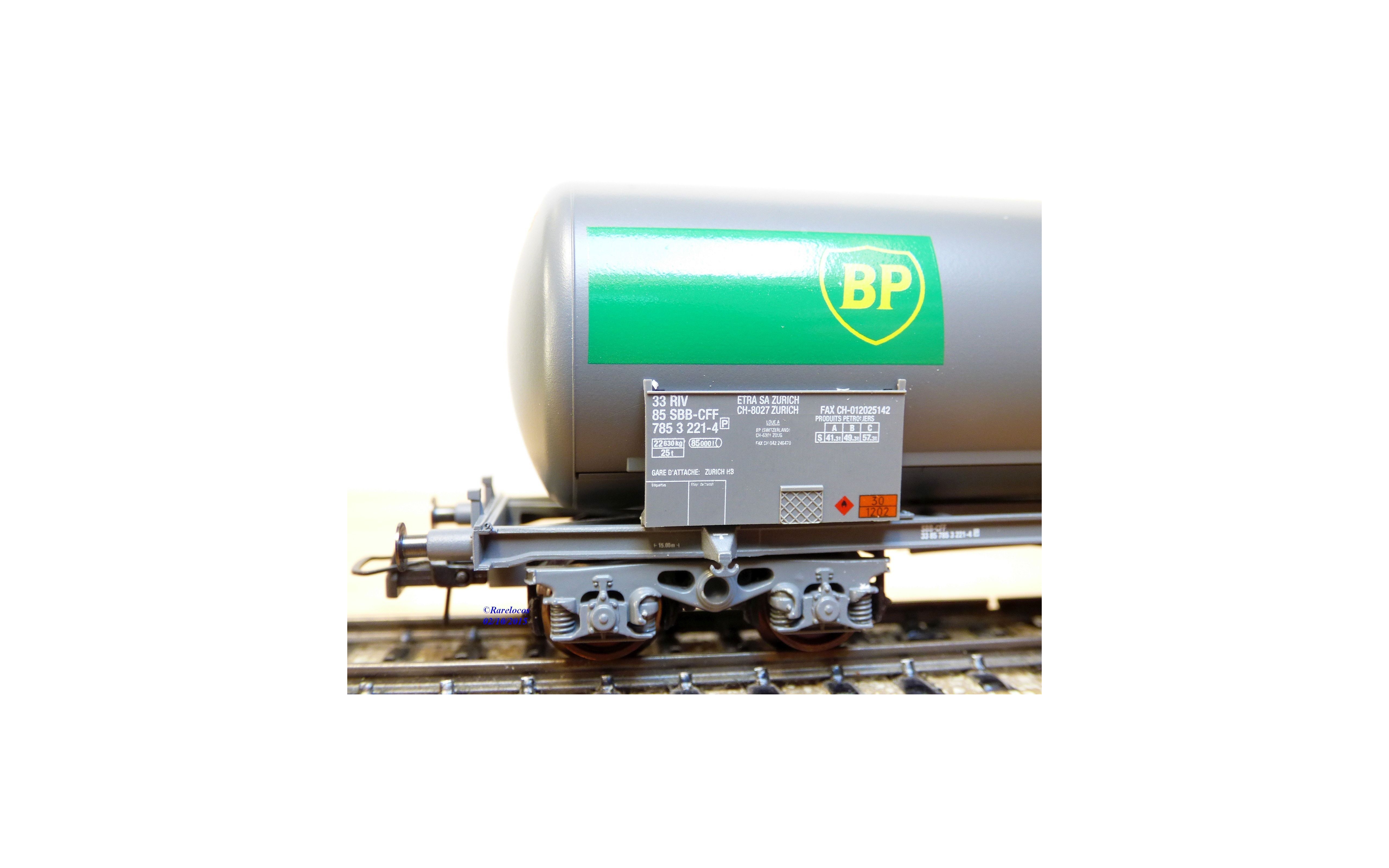 Wagon citerne à 2 bogies type Uahs des chemins de fer suisses ( SBB/CFF/FFS) , chassis et mains montoires en métal, citerne en plastique, livrée grise avec marquages BP, attelages à élongation, immatriculation : 33 85 785 3 221-4, notice présente, boîte d'origine en état neuf.