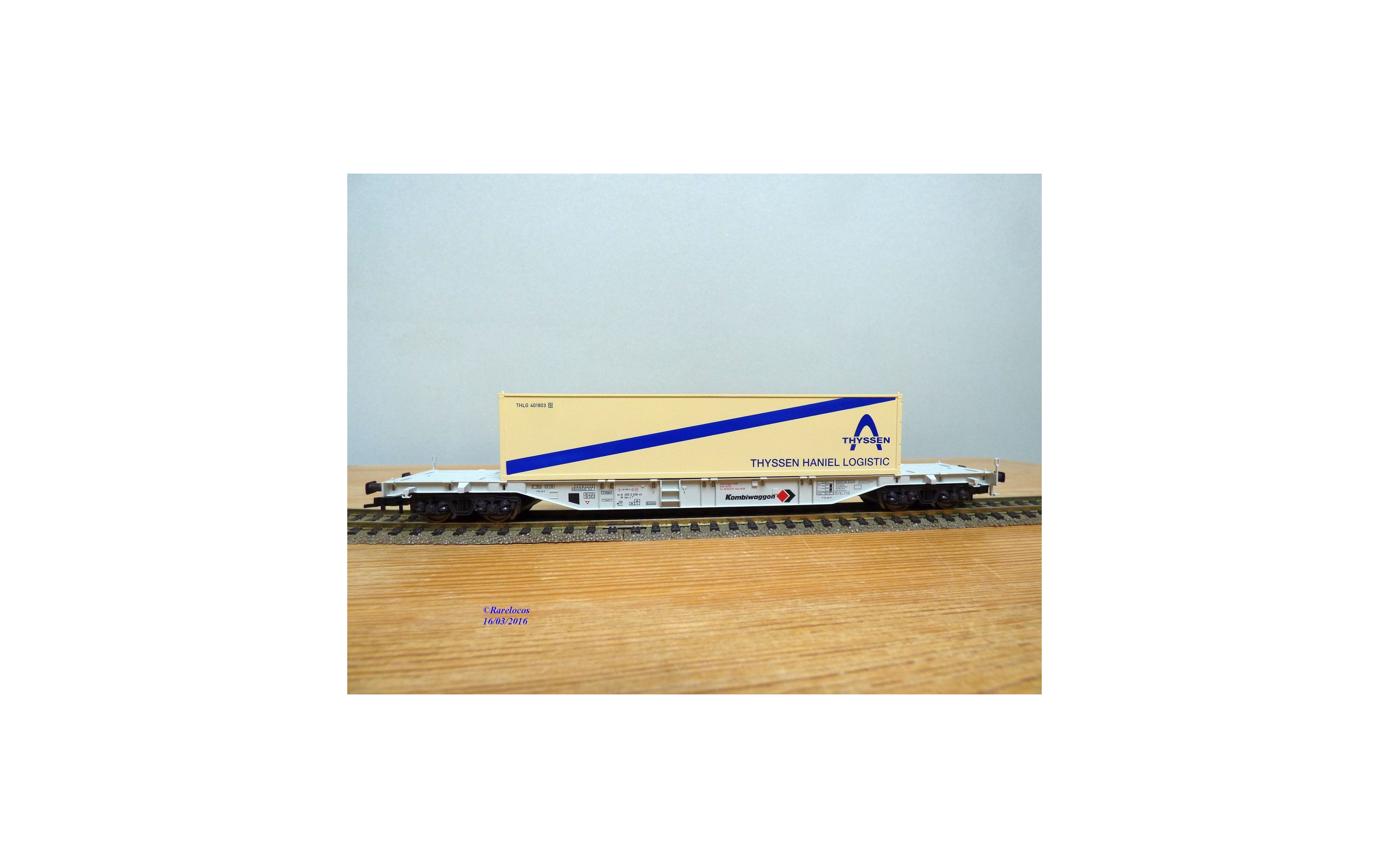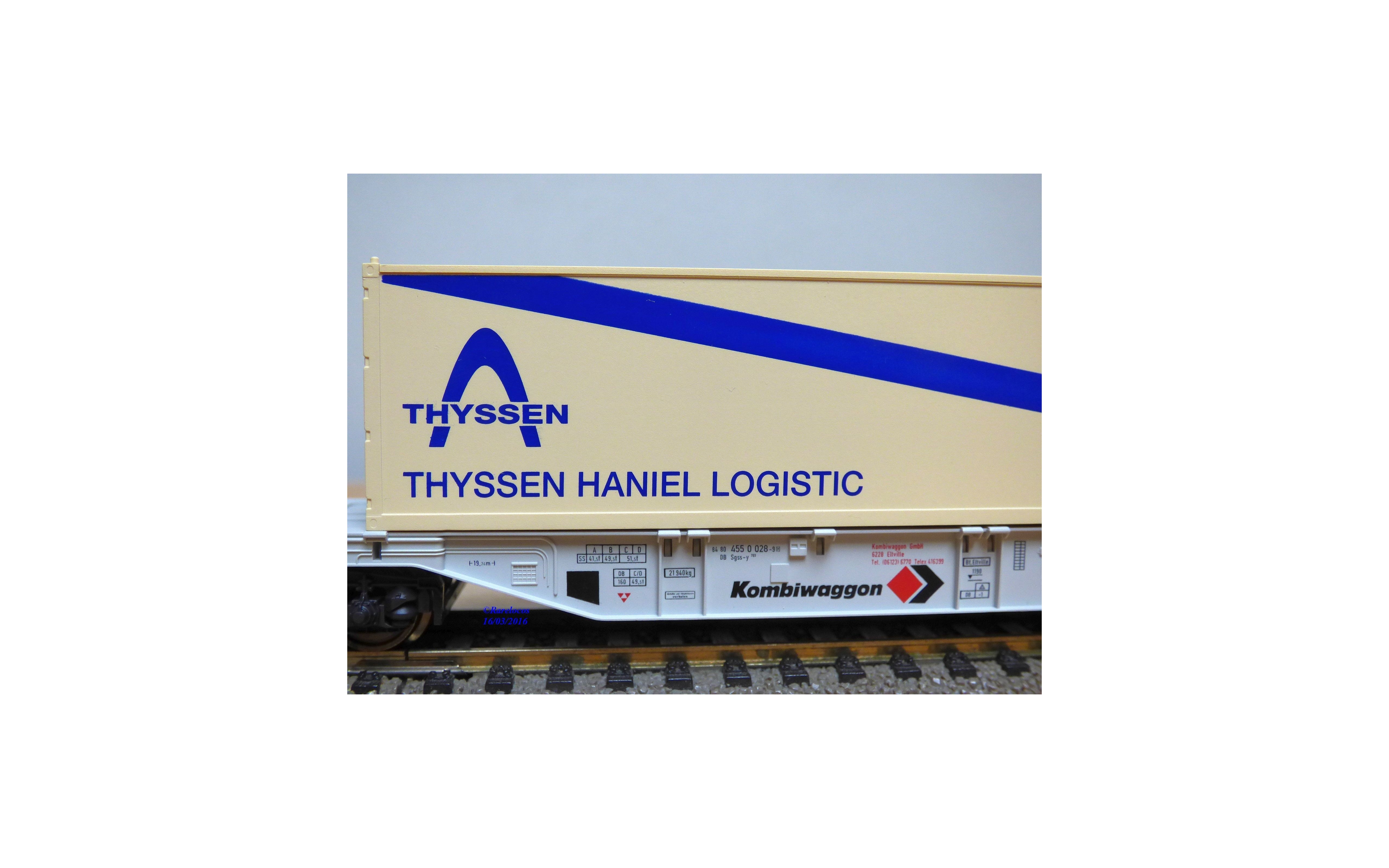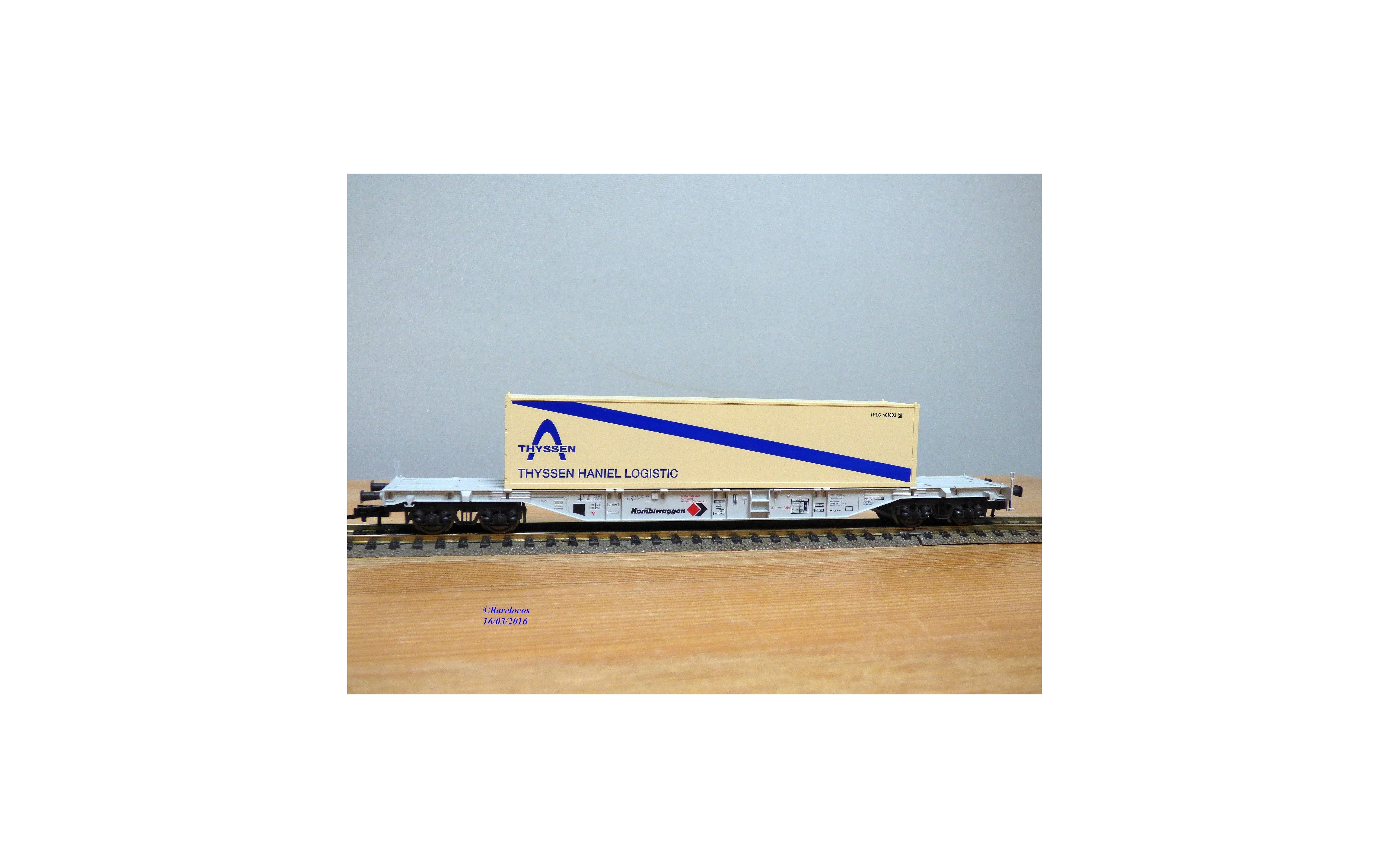 Wagon plat porte conteneurs à bogies type Sgss-y des chemins de fer allemands ( DB ), chargé d'un conteneur de 40 ' aux couleurs de THYSSEN HANIEL LOGISTIC, attelages à élongation, boîte d'origine en état neuf.
