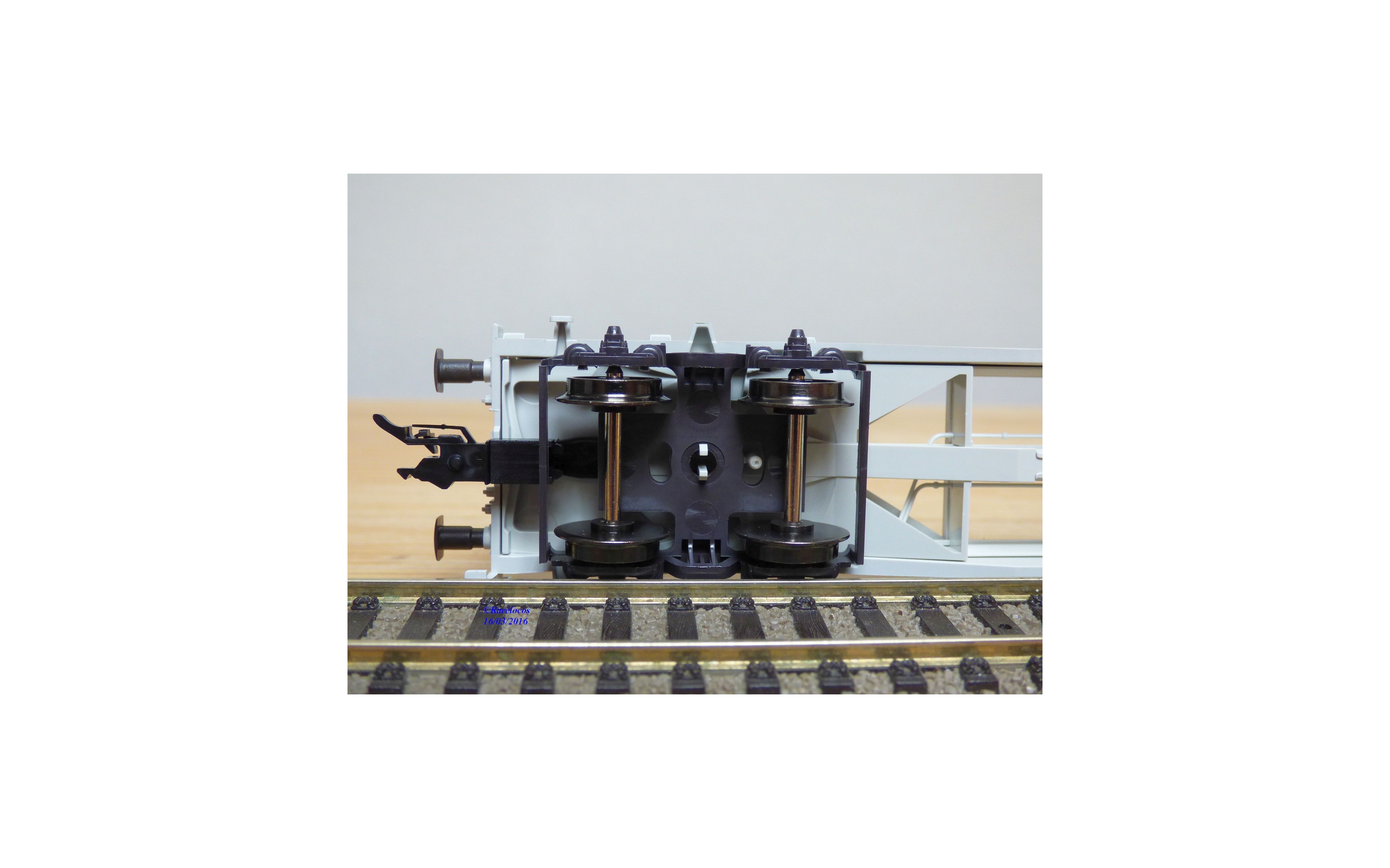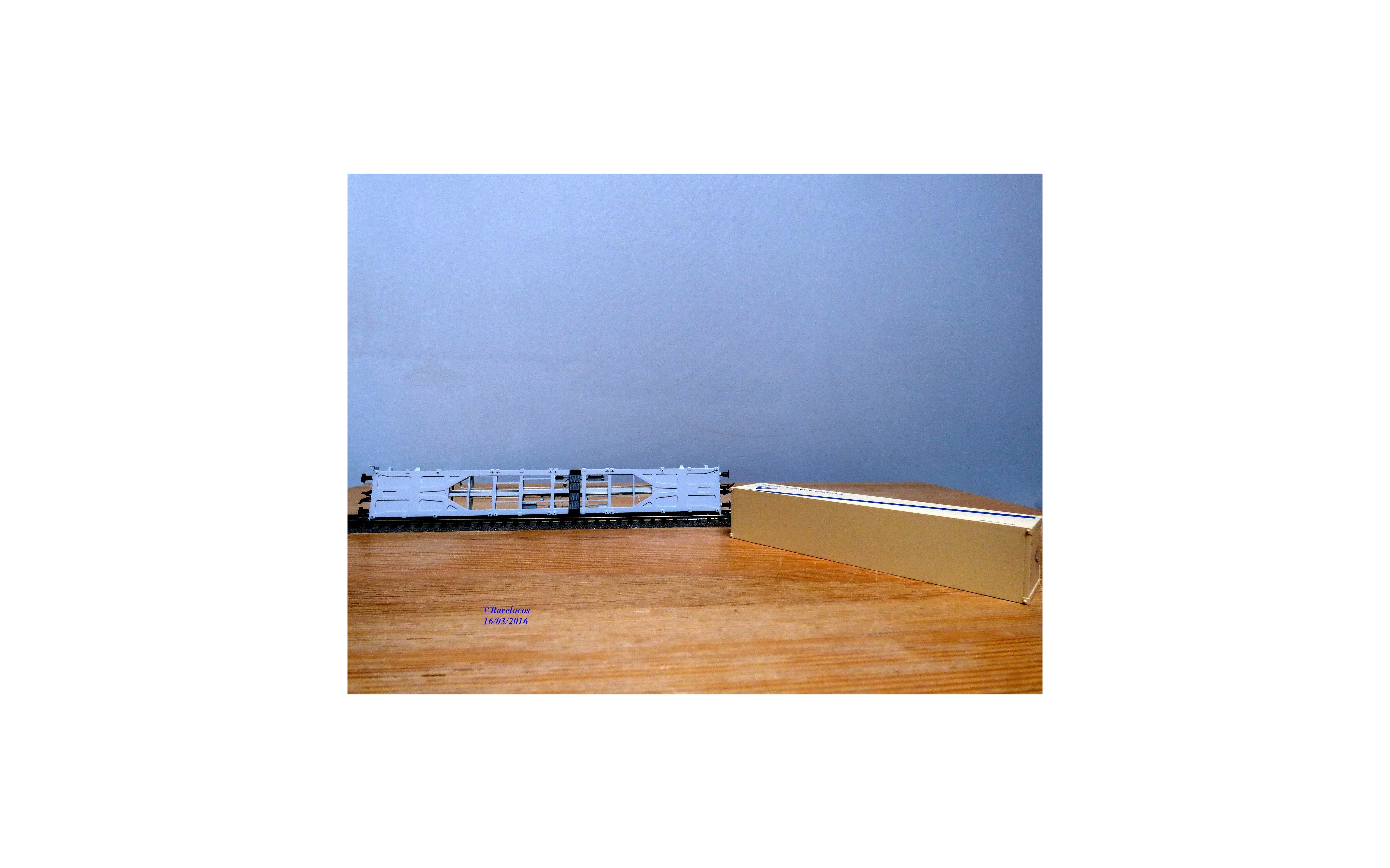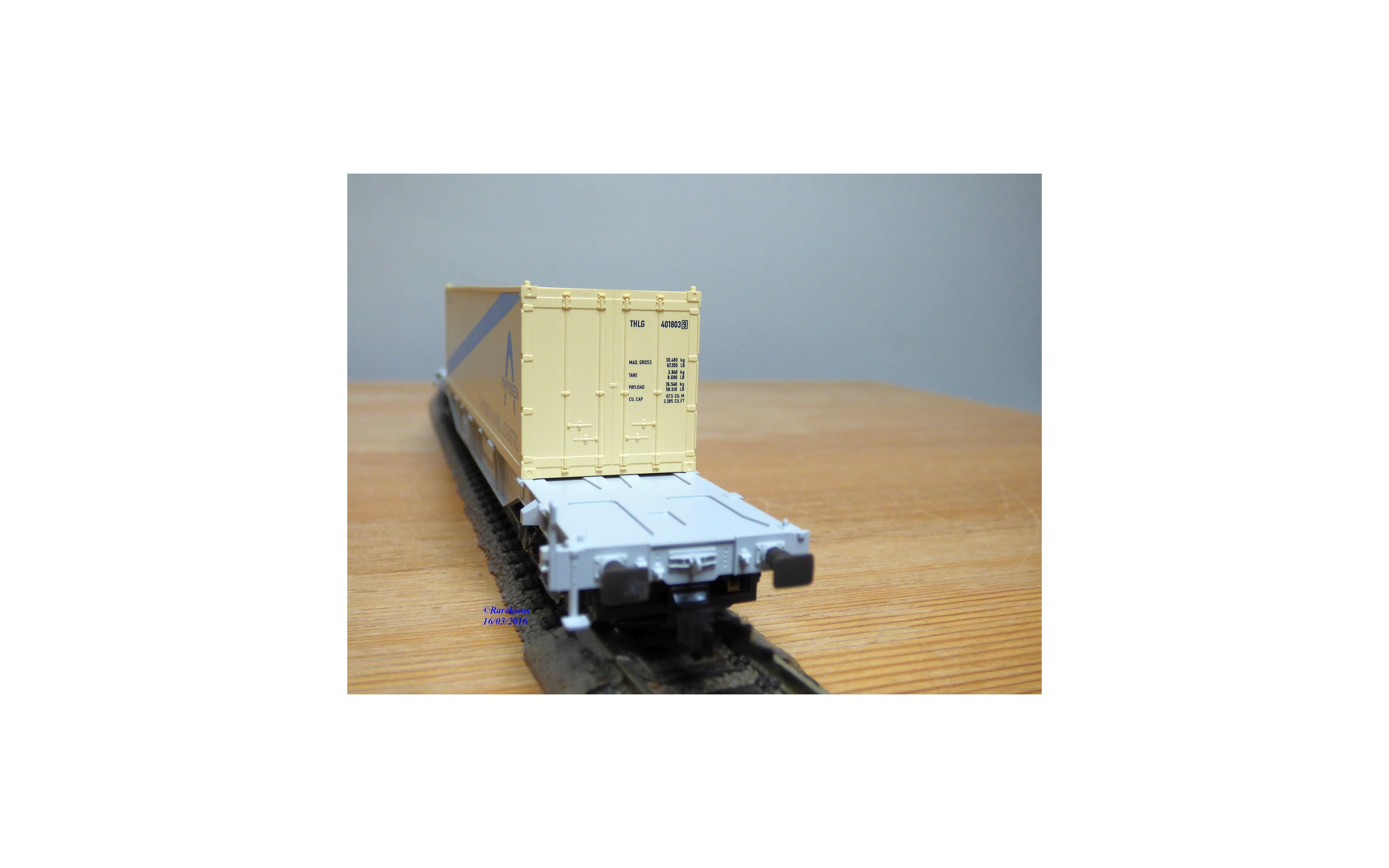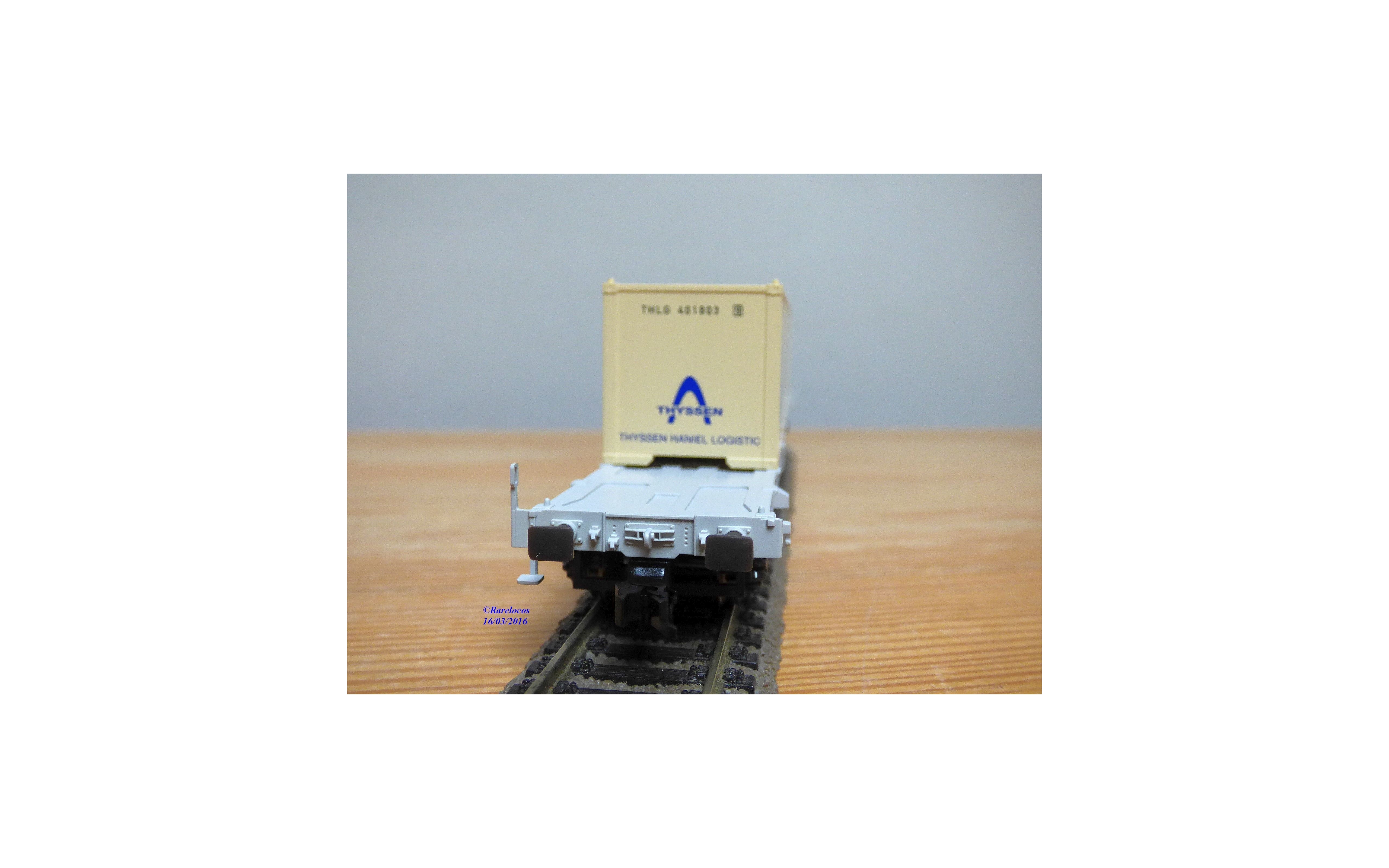 Wagon plat porte conteneurs à bogies type Sgss-y des chemins de fer allemands ( DB ), chargé d'un conteneur de 40 ' aux couleurs de THYSSEN HANIEL LOGISTIC, attelages à élongation, boîte d'origine en état neuf.