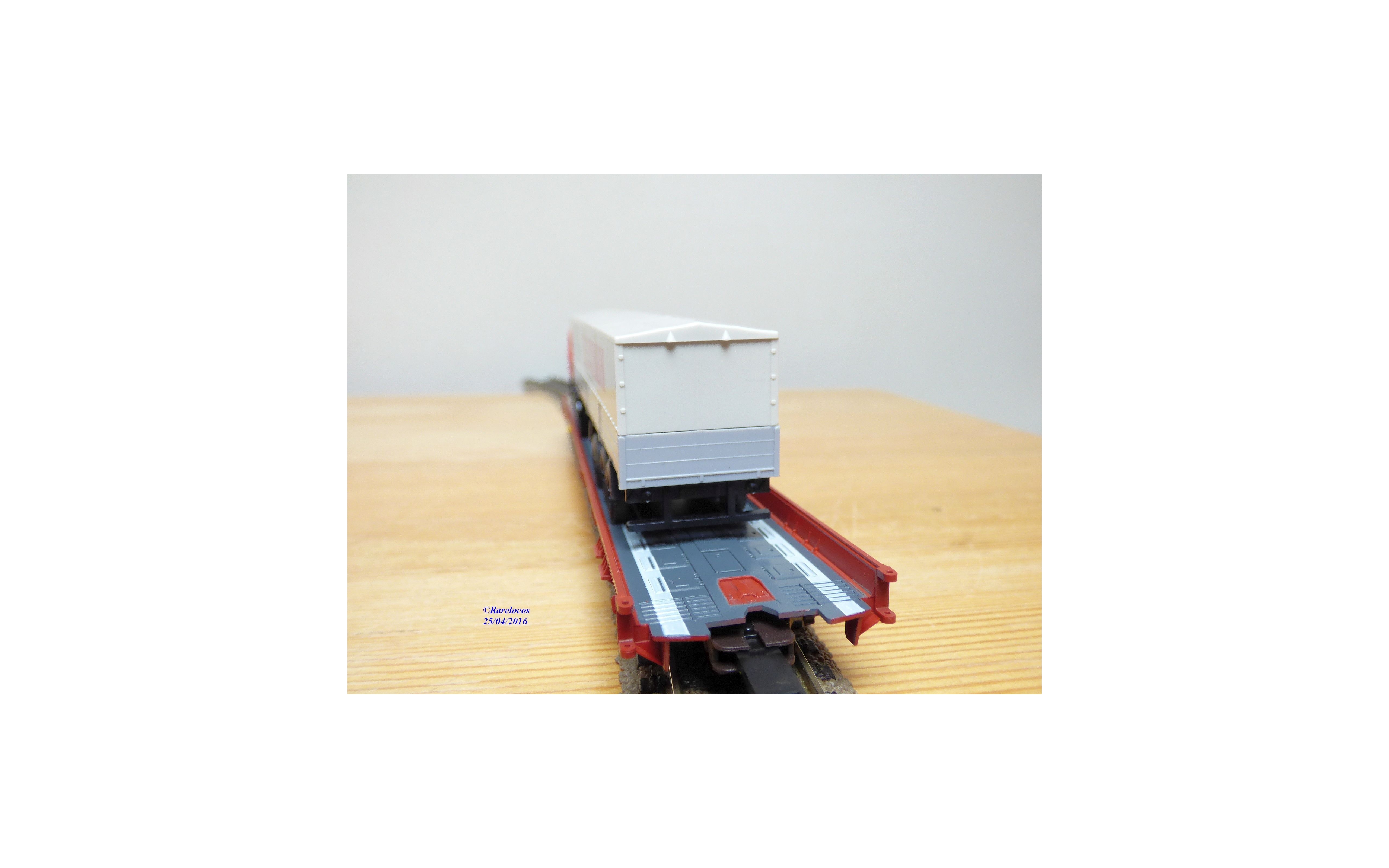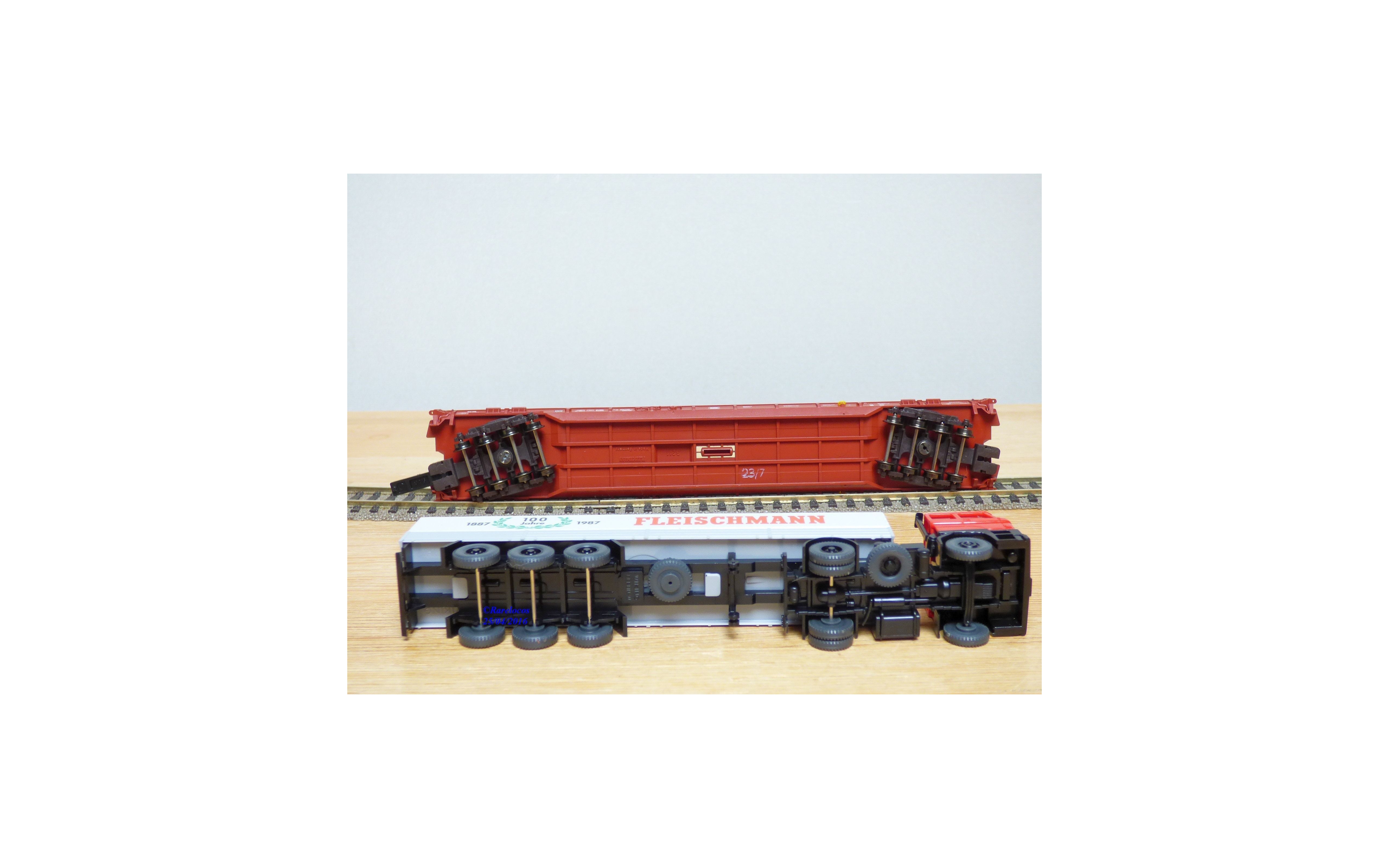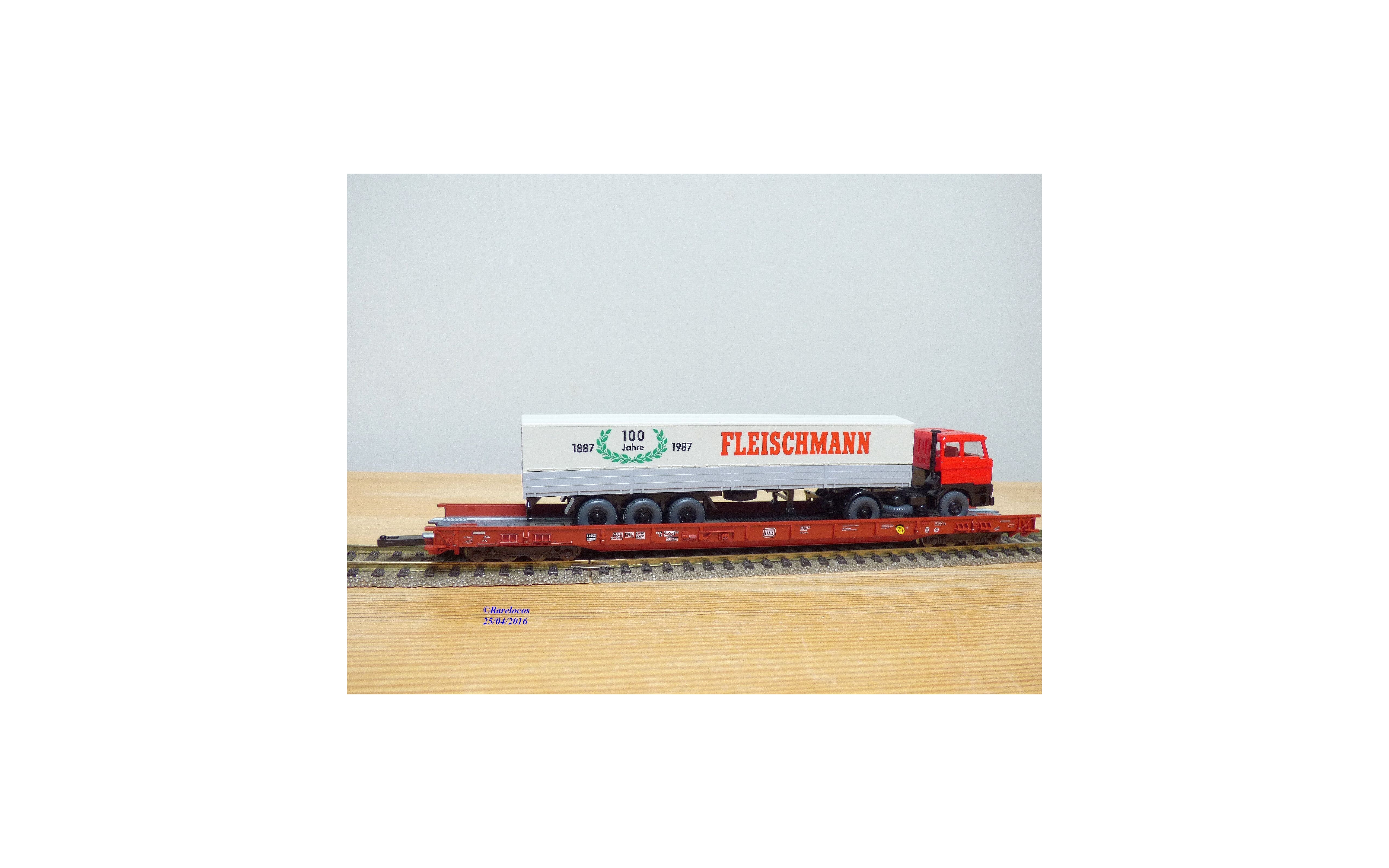 Wagon surbaissé pour transport de camions ( Rollende Landstrasse) à 2 bogies de 4 essieux type Saadkms.690 des chemins de fer allemands ( DB ) chargé d'un camion semi remorque VOLVO/DAF ( Wiking ) bâché aux couleurs du centenaire de Fleischmann, boîte d'origine en état neuf.