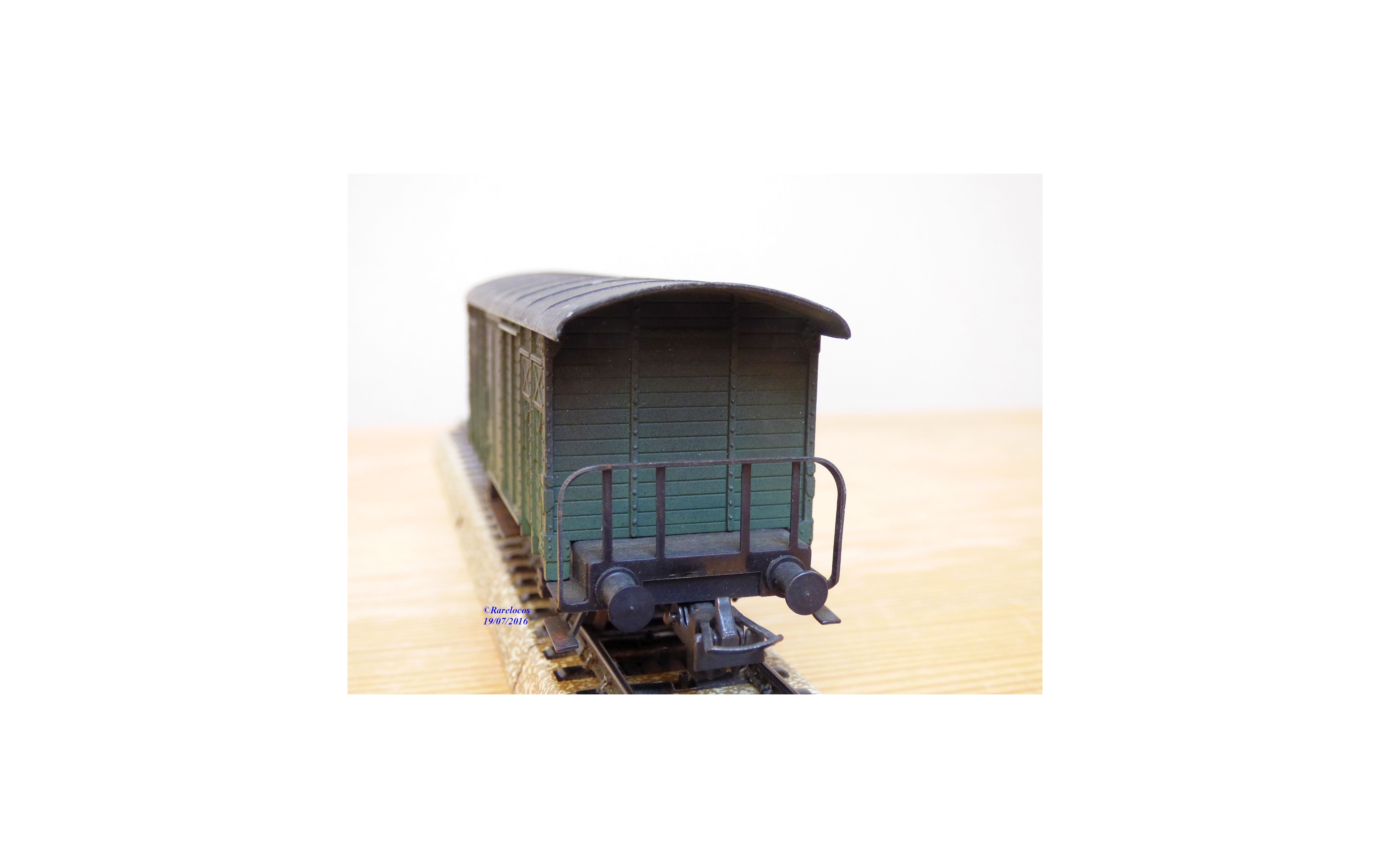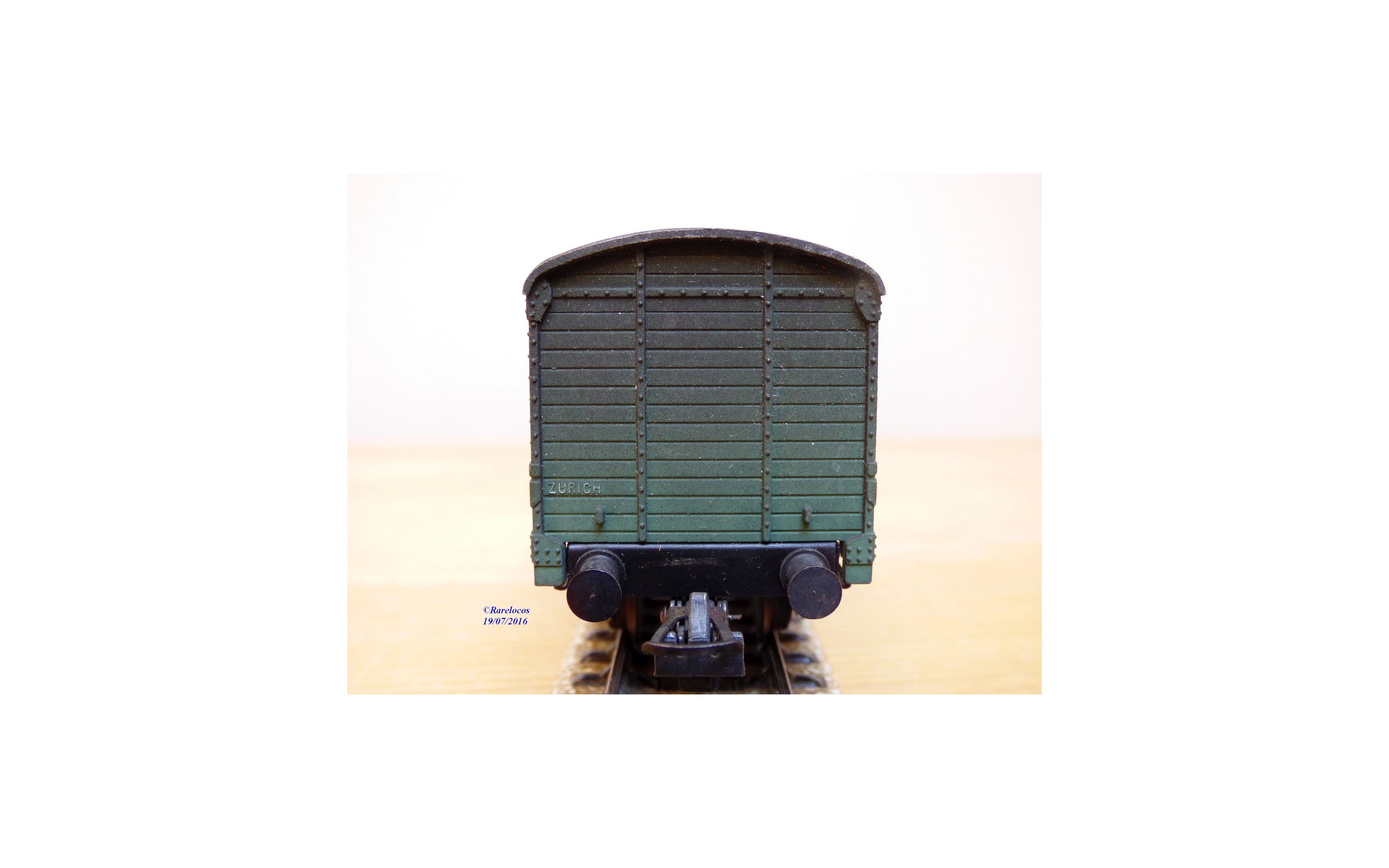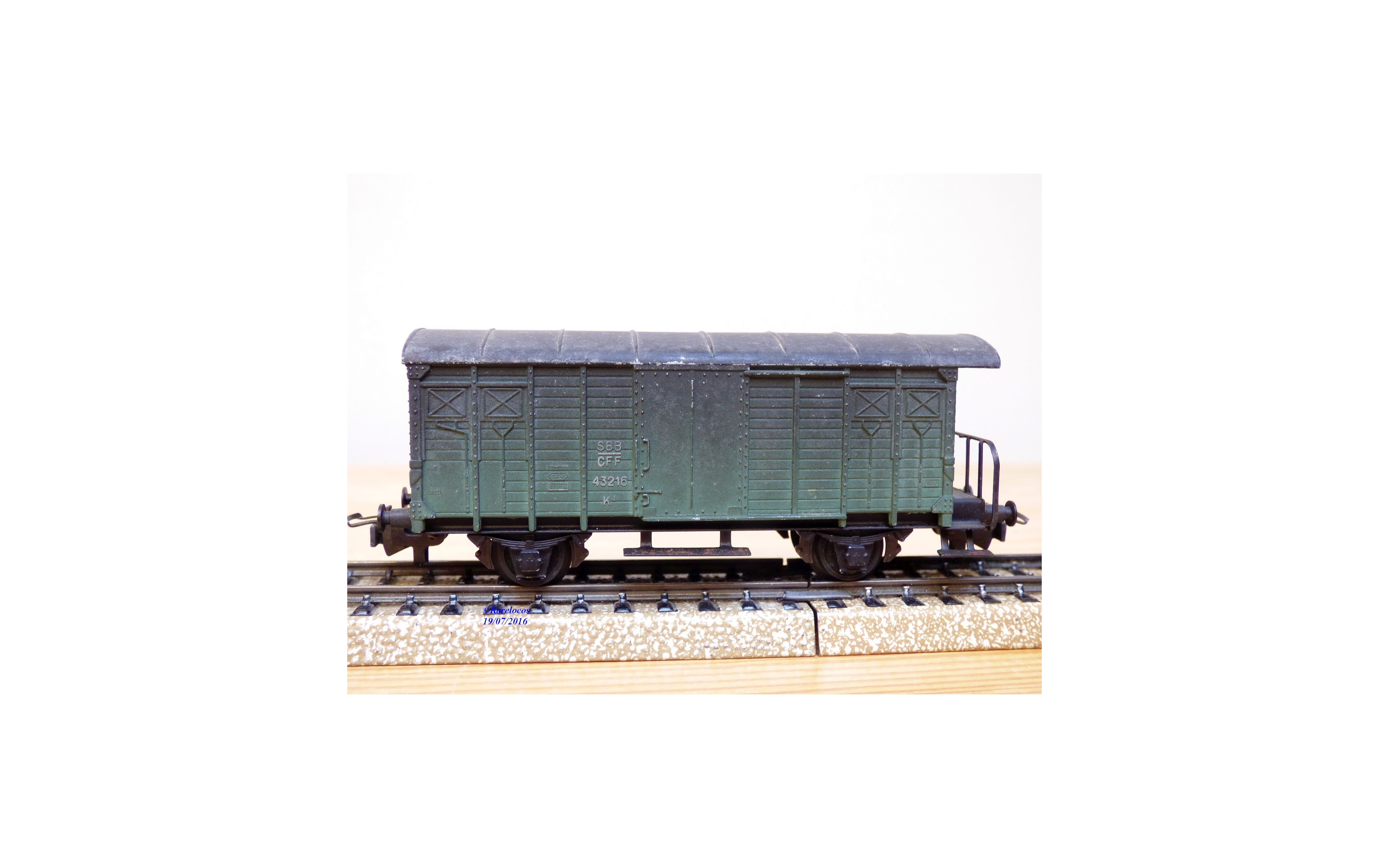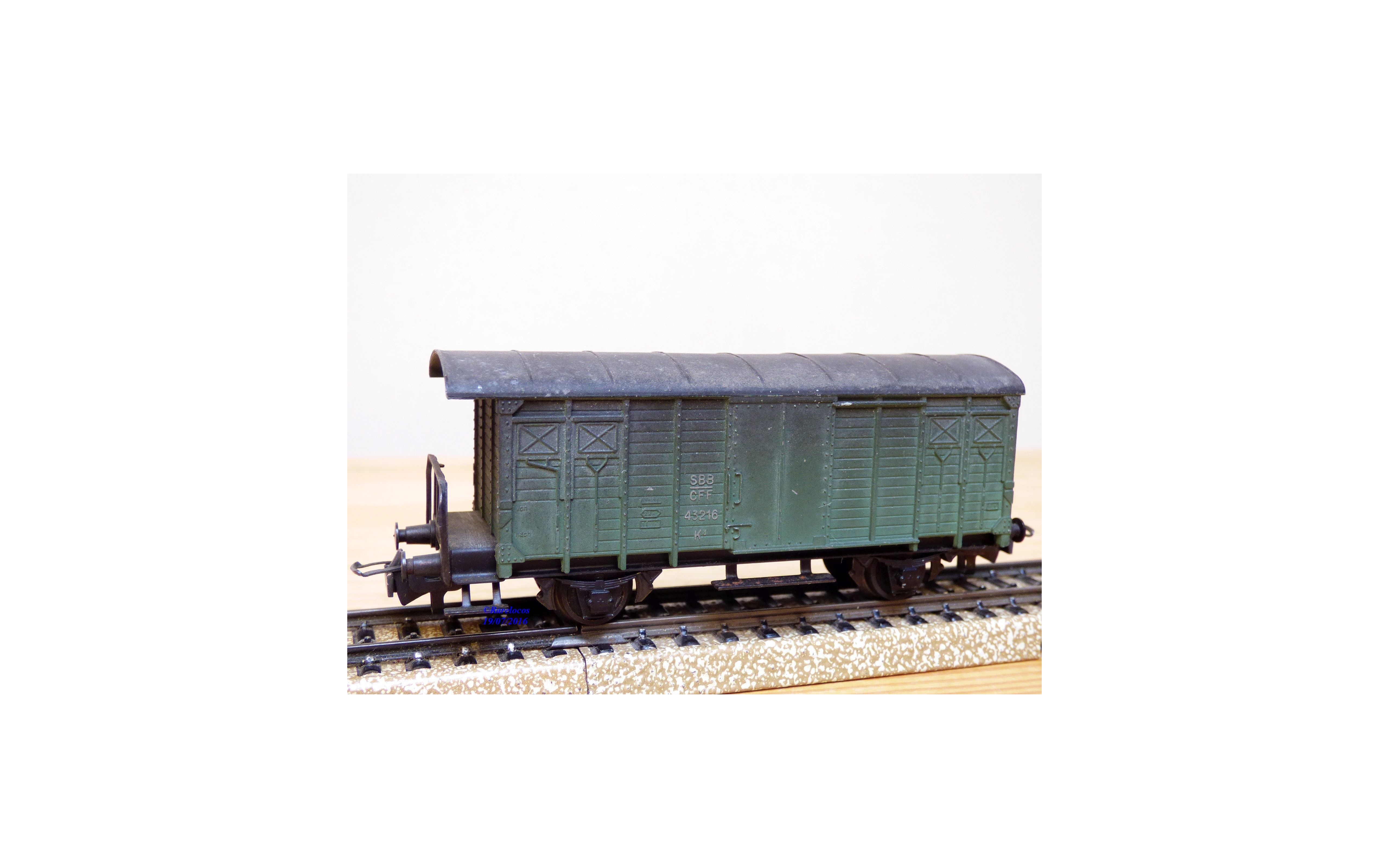 Rare wagon couvert à plate forme de serre feins à 2 essieux type K3 des chemins de fer suisses ( SBB/CFF/FFS), livrée verte à toit noir patiné d'usine, tout en métal, immatriculation : 43216, boîte d'origine en très bon état.