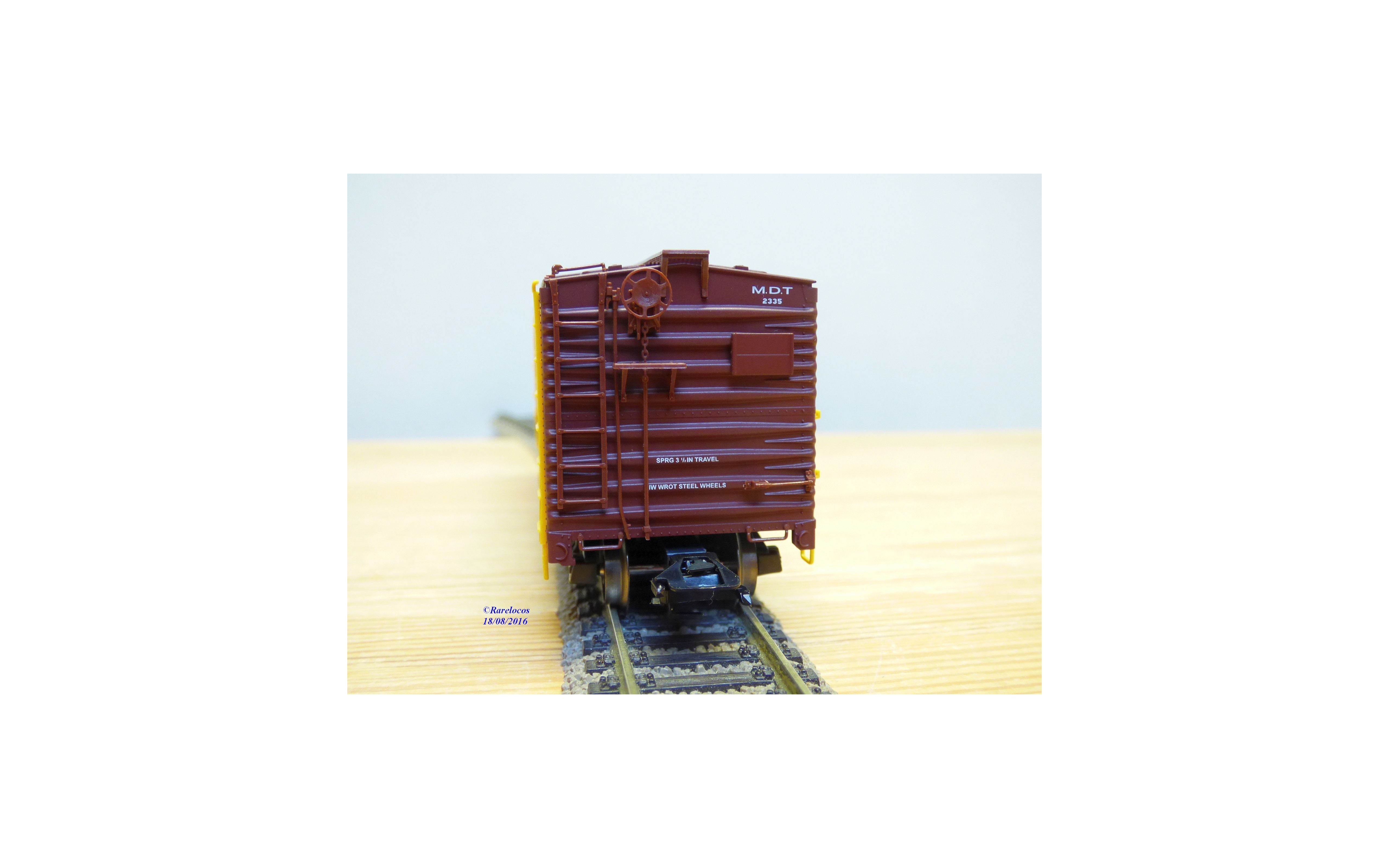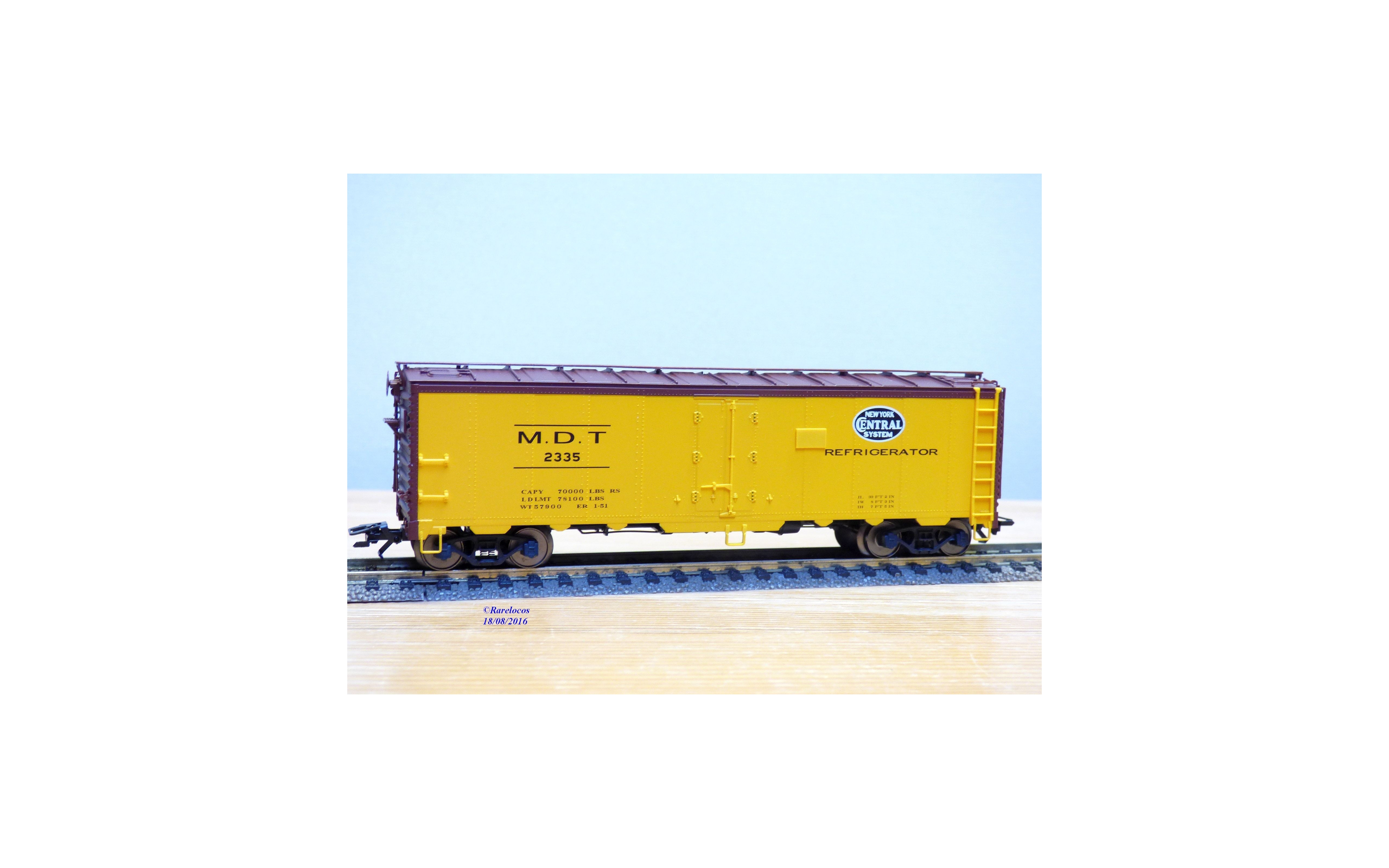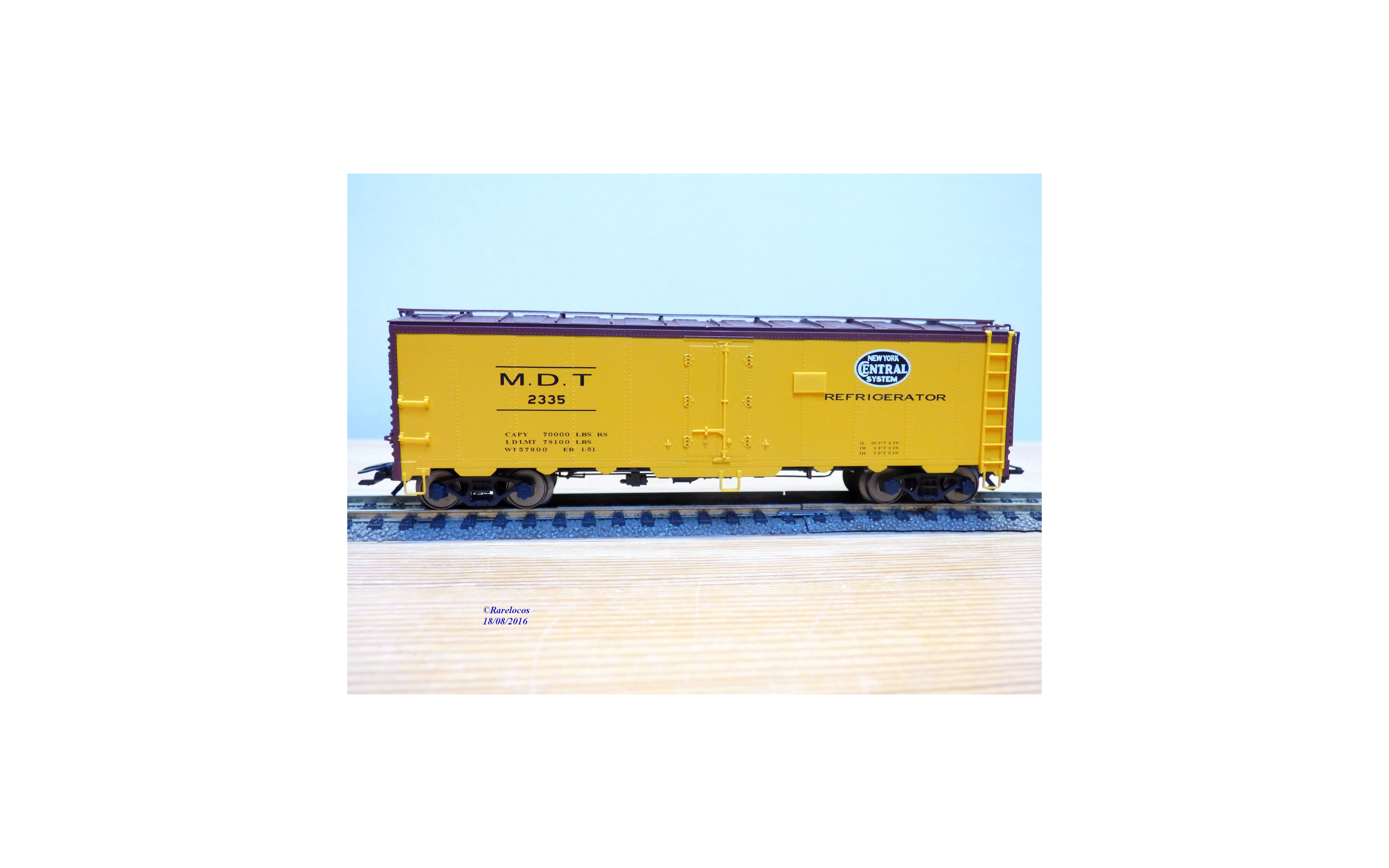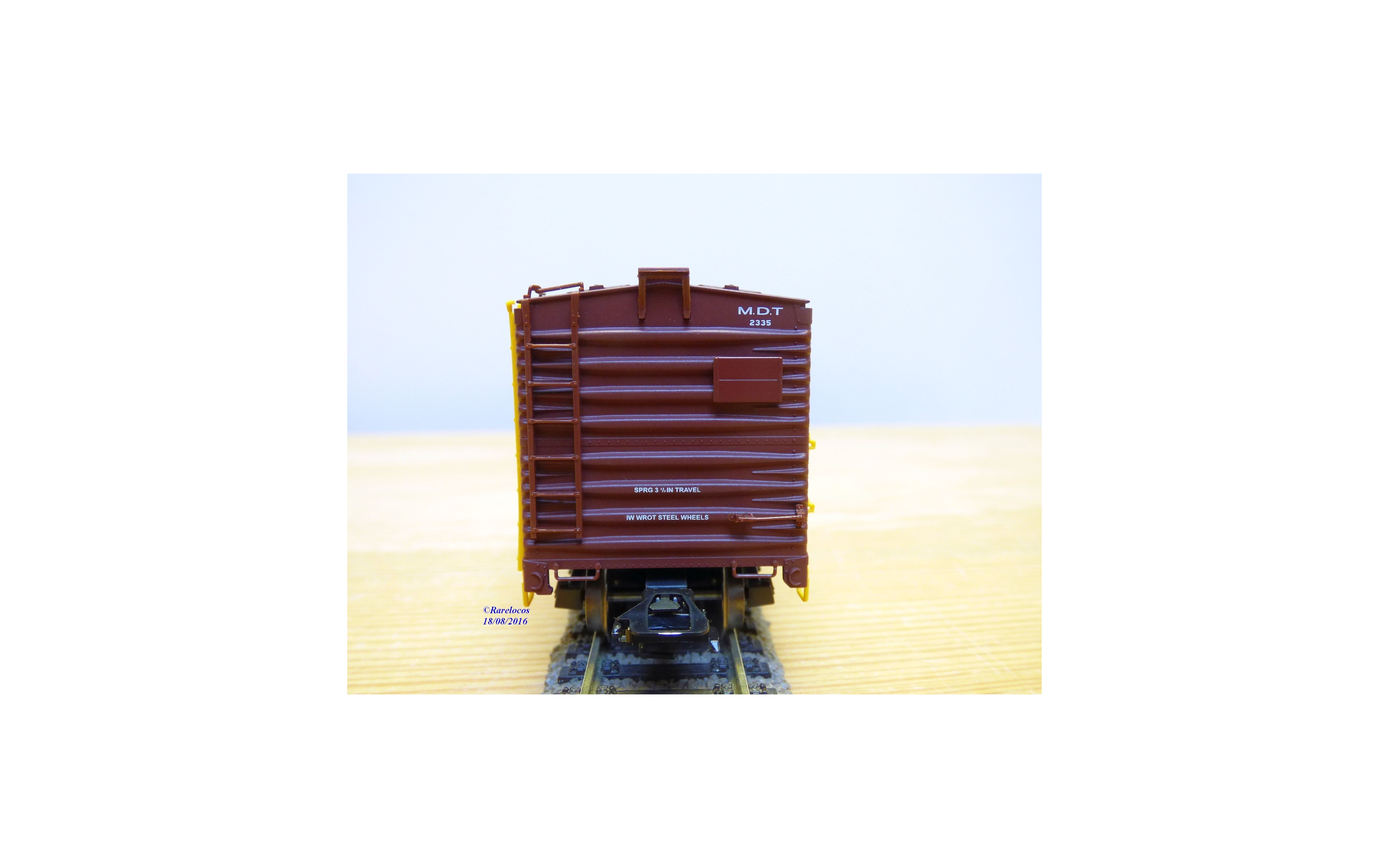 Wagon couvert des chemins de fer américains ( NYC : New York Central ), livrée jaune à toit marron avec marquages M.D.T, essieux suspendus sur ressorts, boîte d'origine en état neuf.