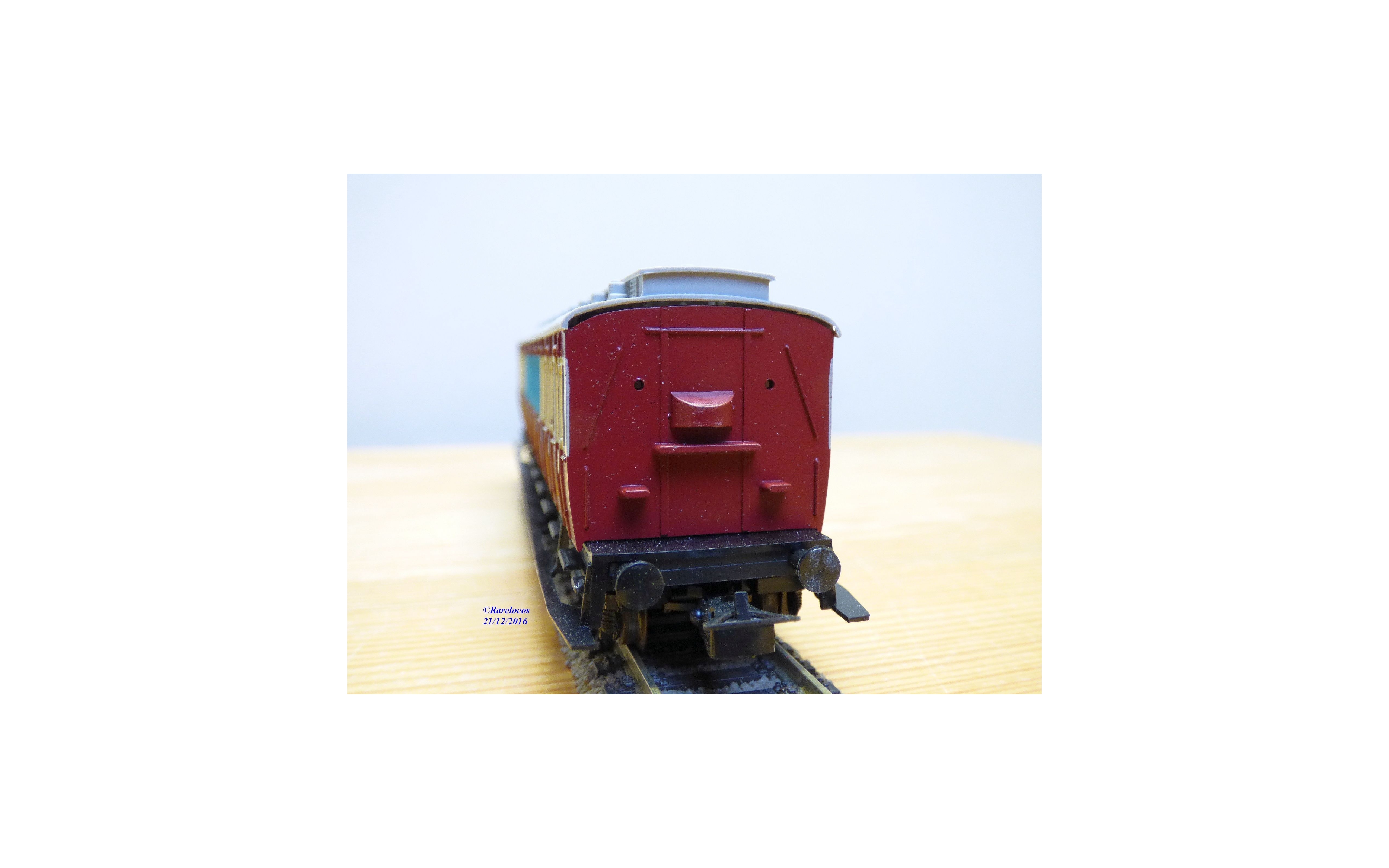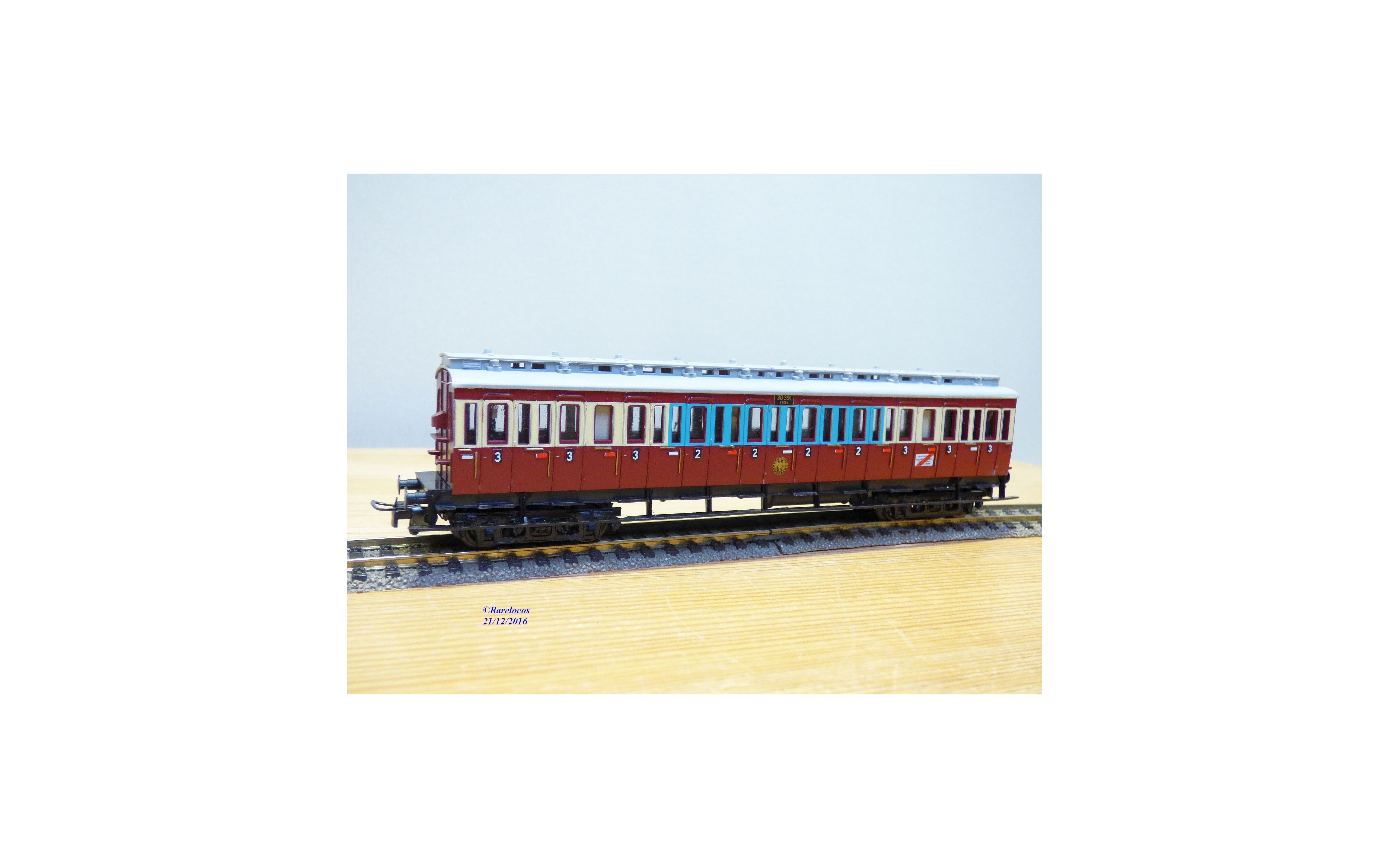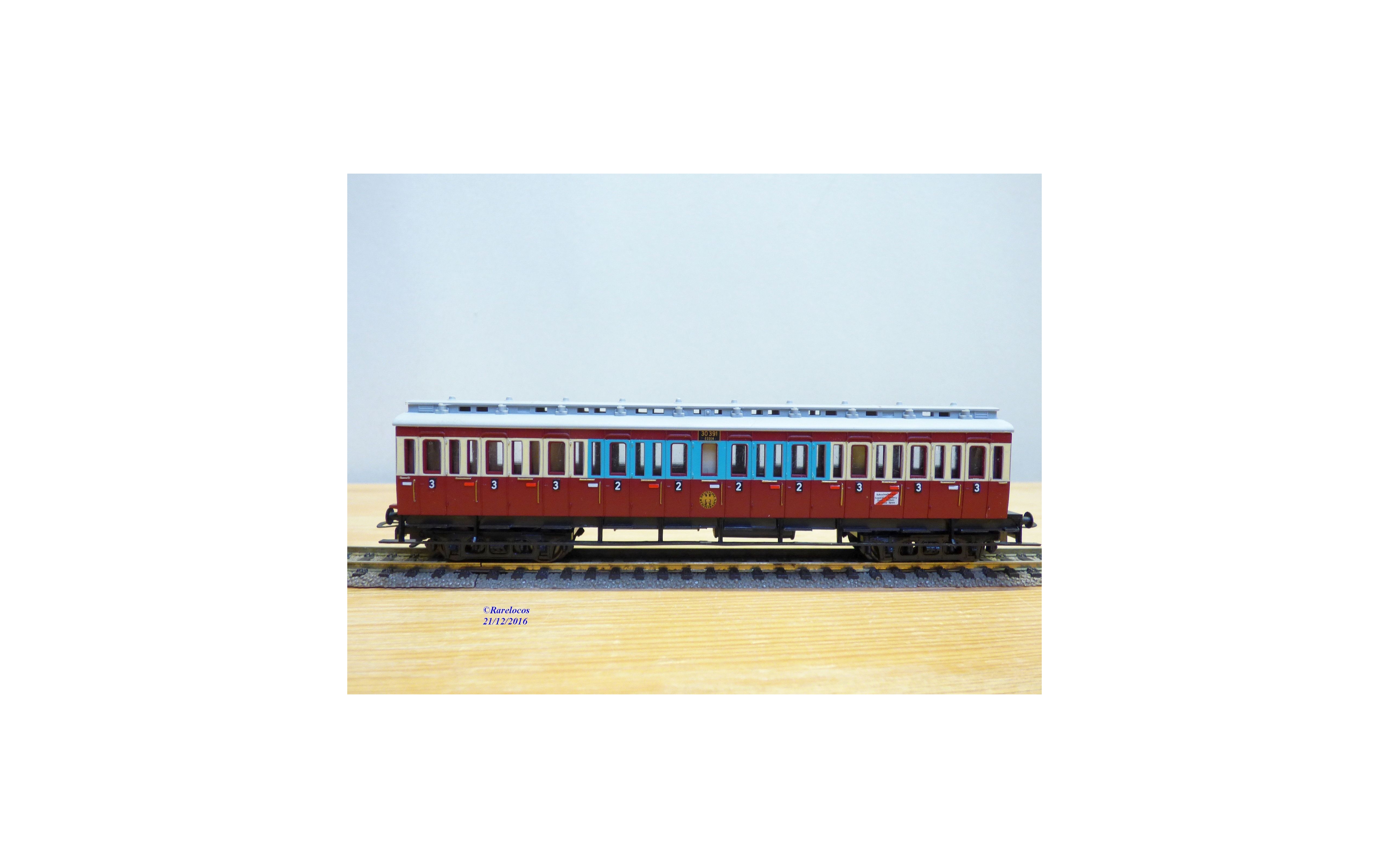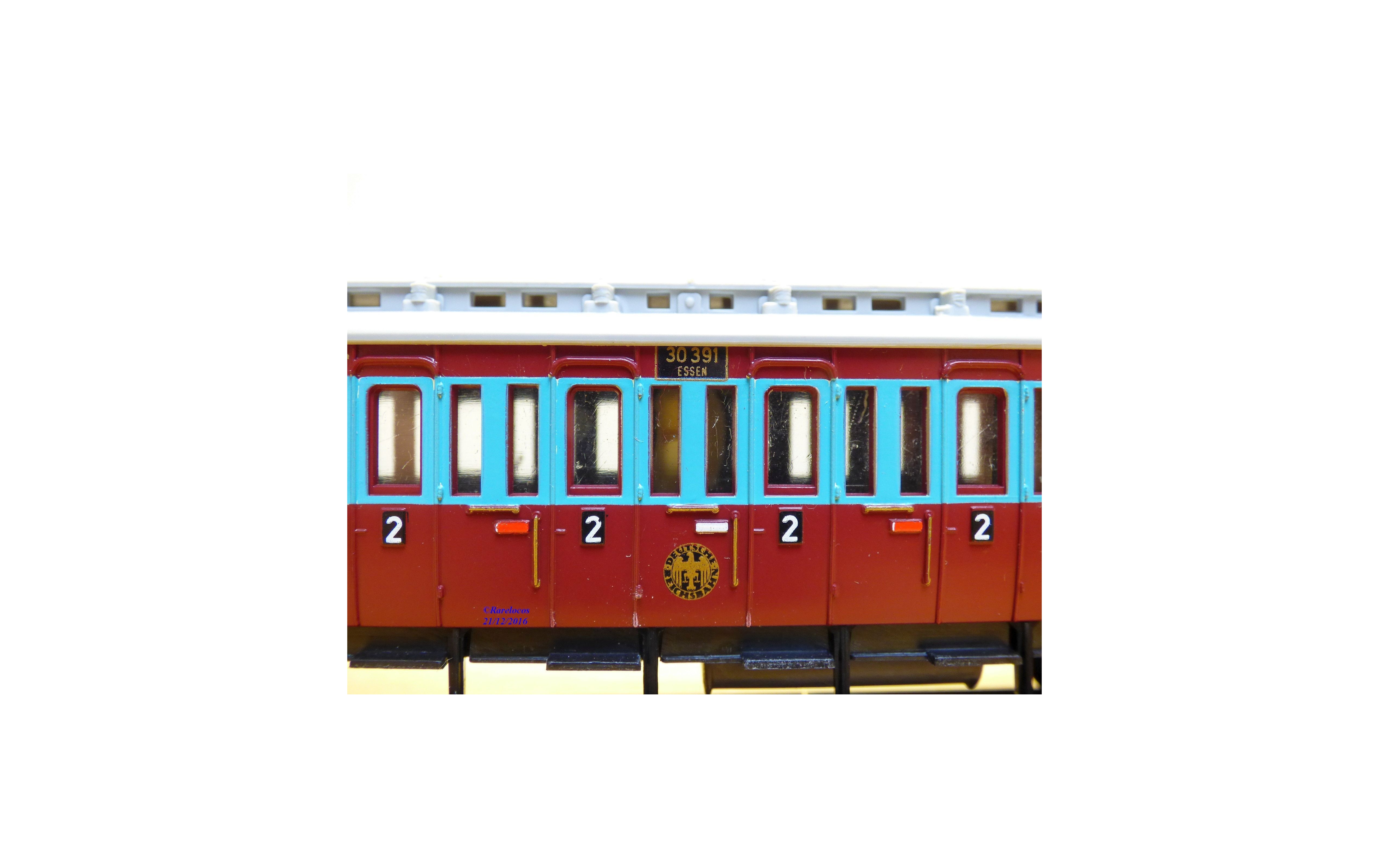 Voiture à compartiments à portières latérales de 2 ème et 3 ème classe à 2 bogies des chemins de fer allemands ( DRG ), livrée Ruhr-Schnellverkehr bariolée lie de vin, blanc et bleu pâle à toit gris, immatriculation :30391 ESSEN , boîte d'origine en état correct.