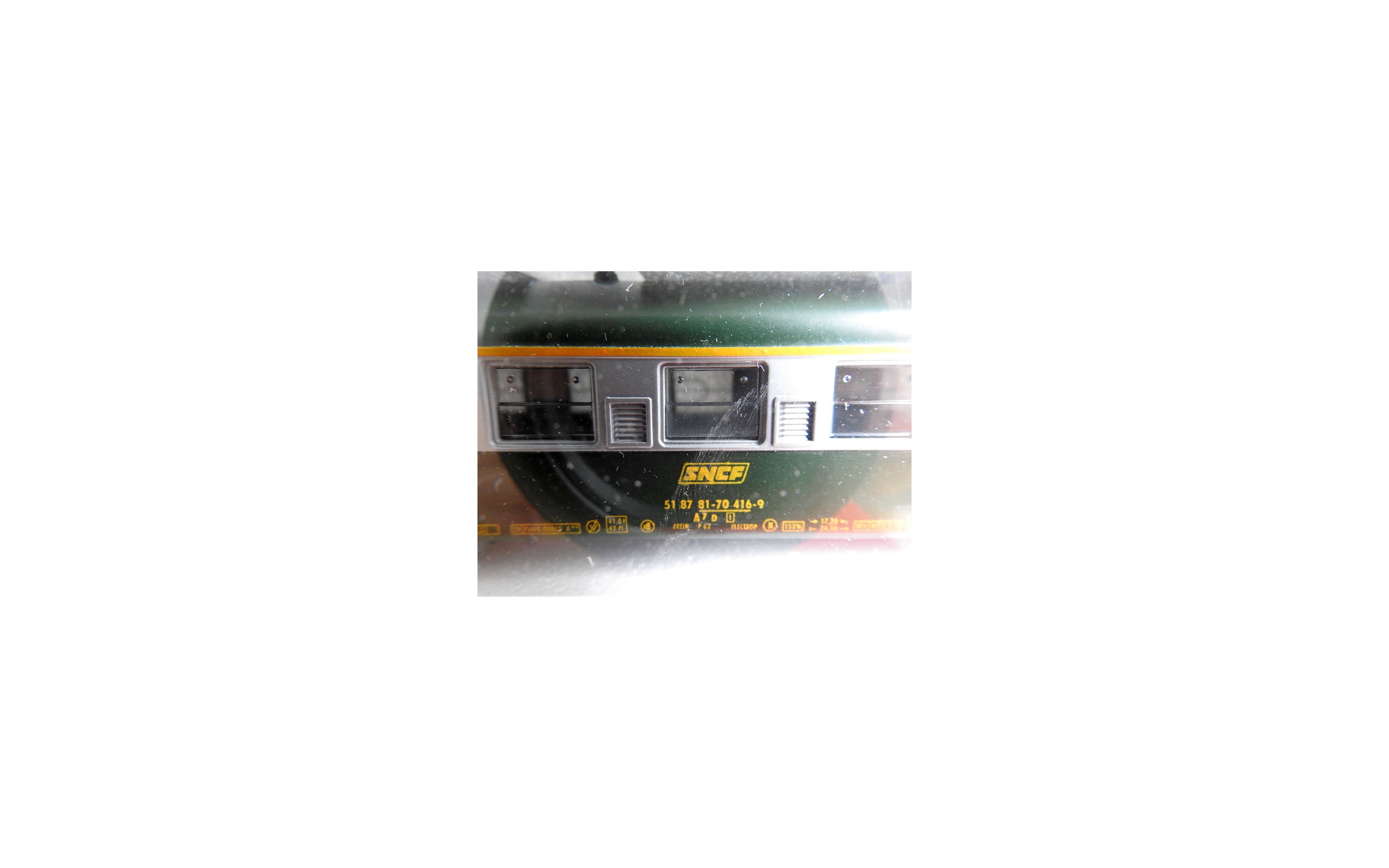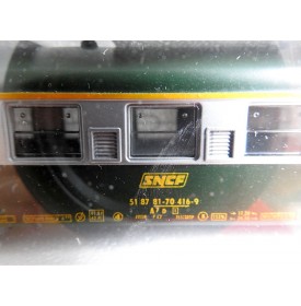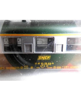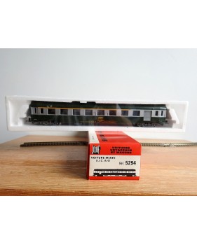 Voiture Y UIC mixte fourgon et 1 ère classe type A7D des chemins de fer français ( SNCF ), livrée vert SNCF à bande grise, boîte d' origine coins piquants encore scellée .