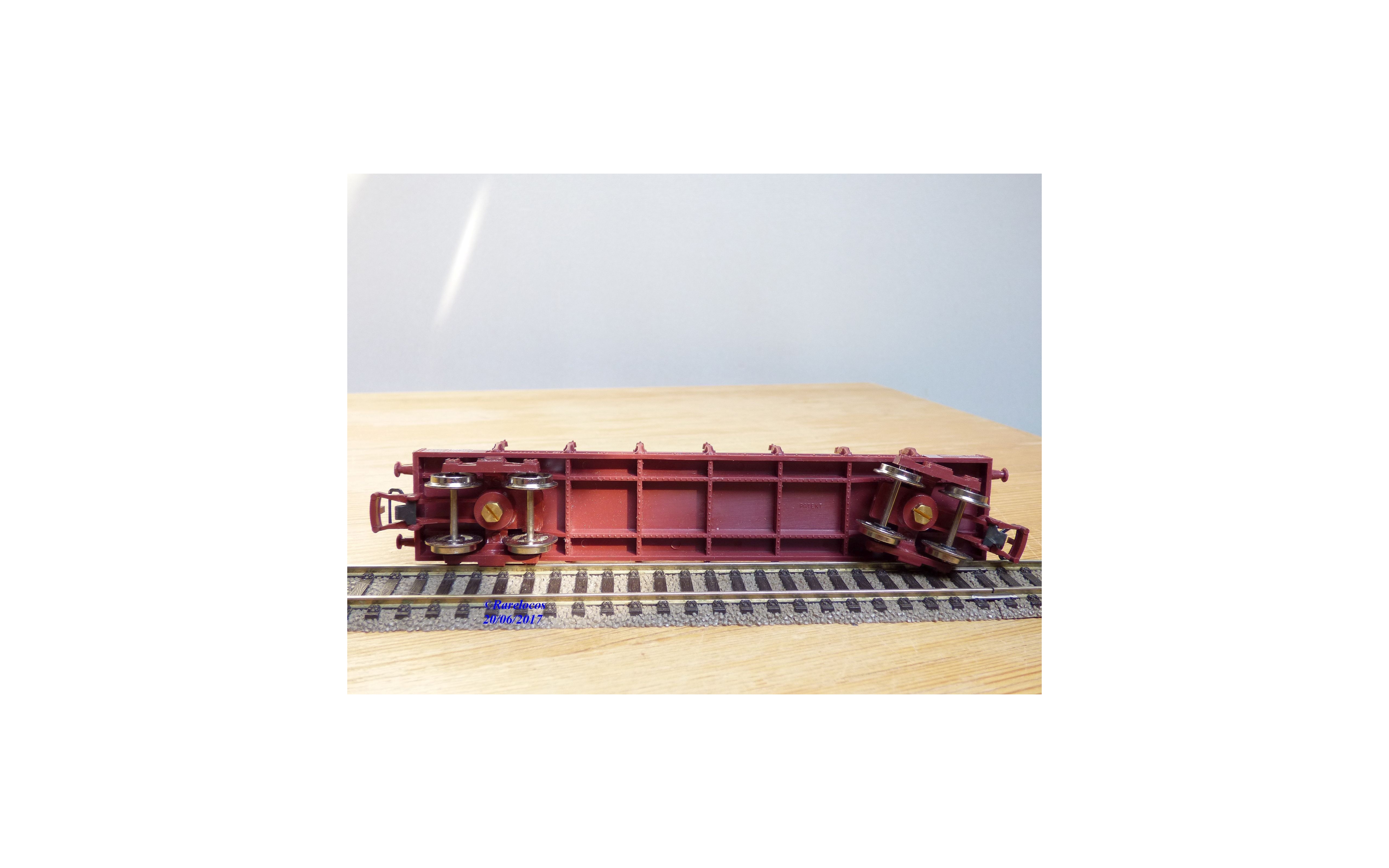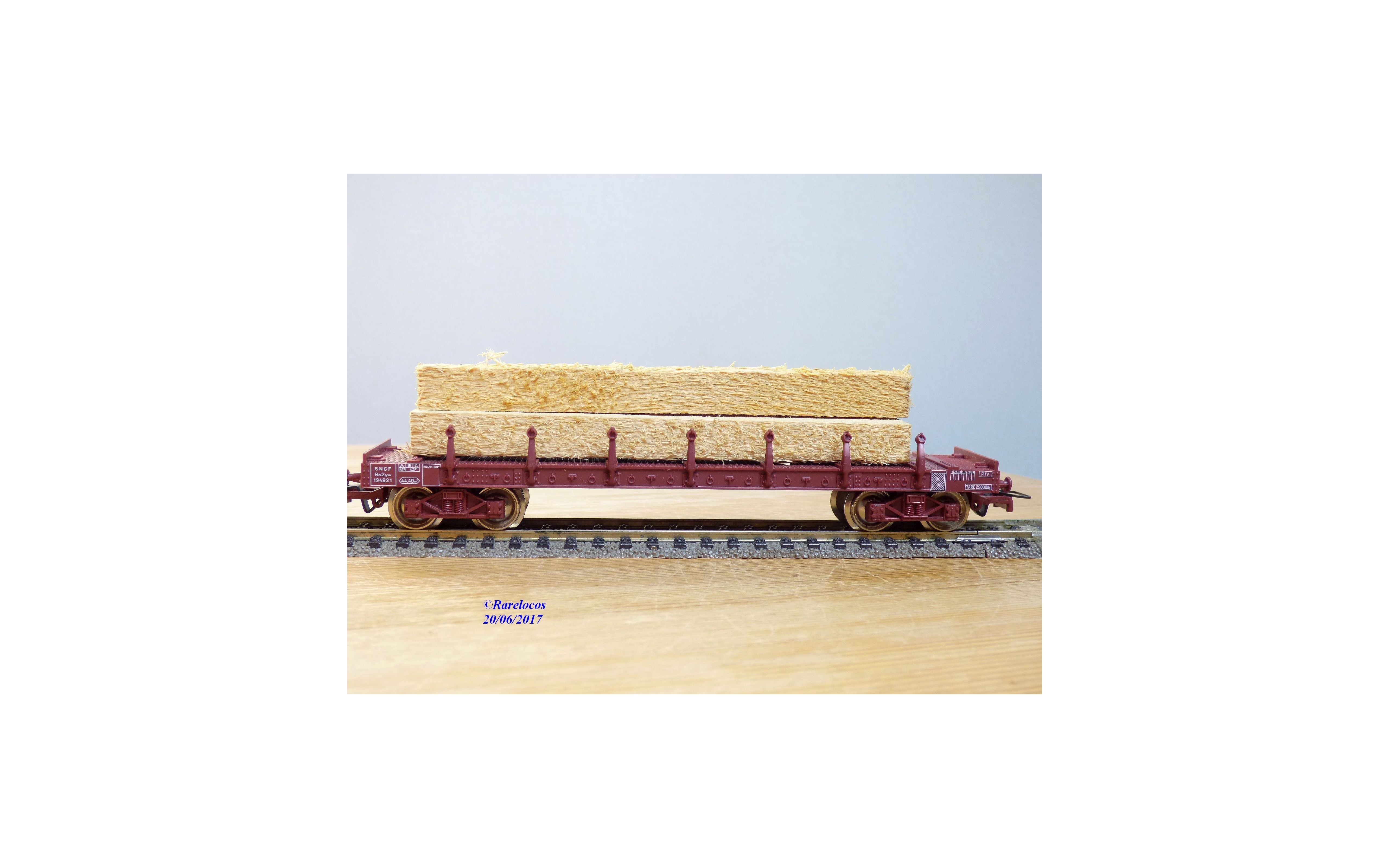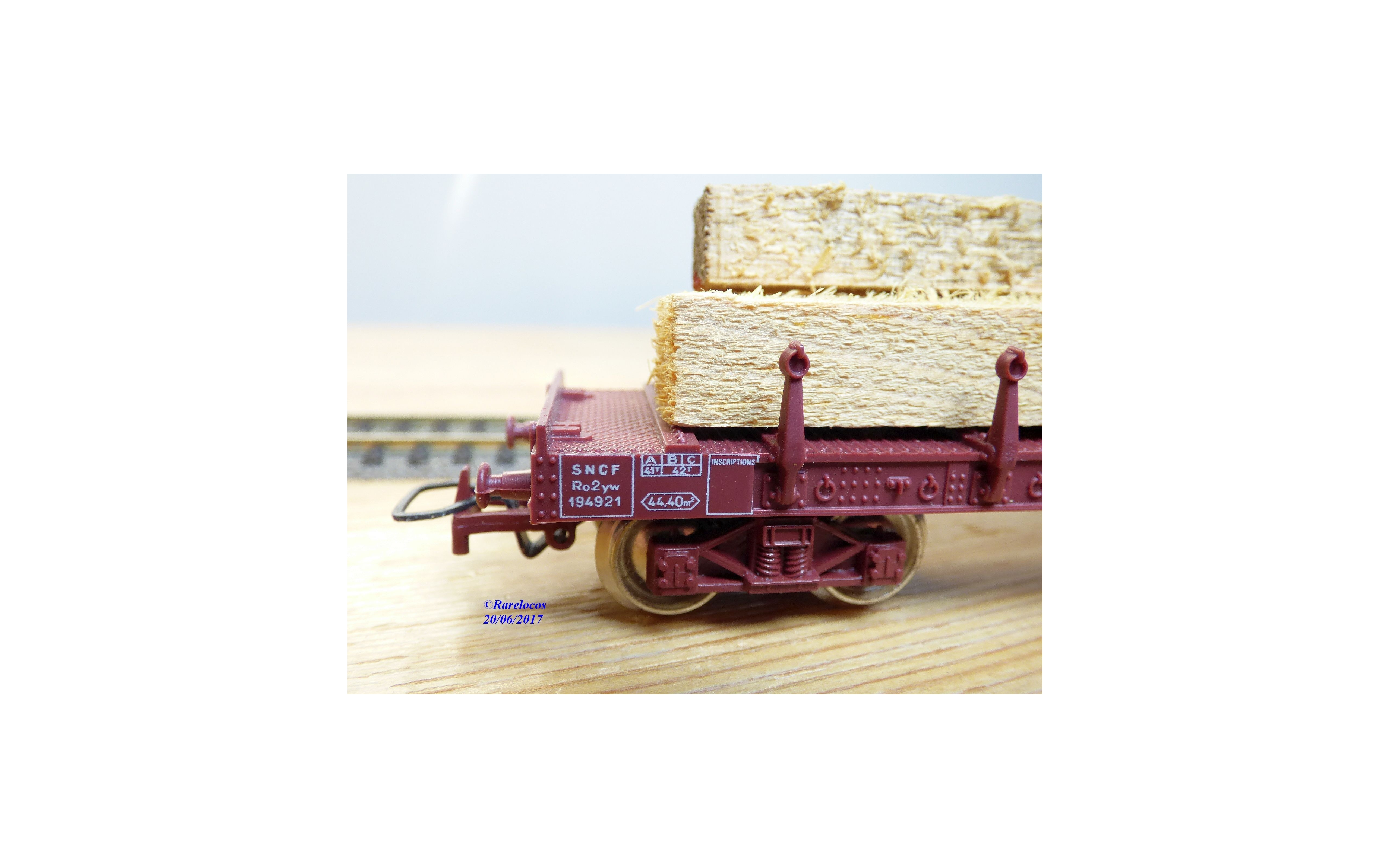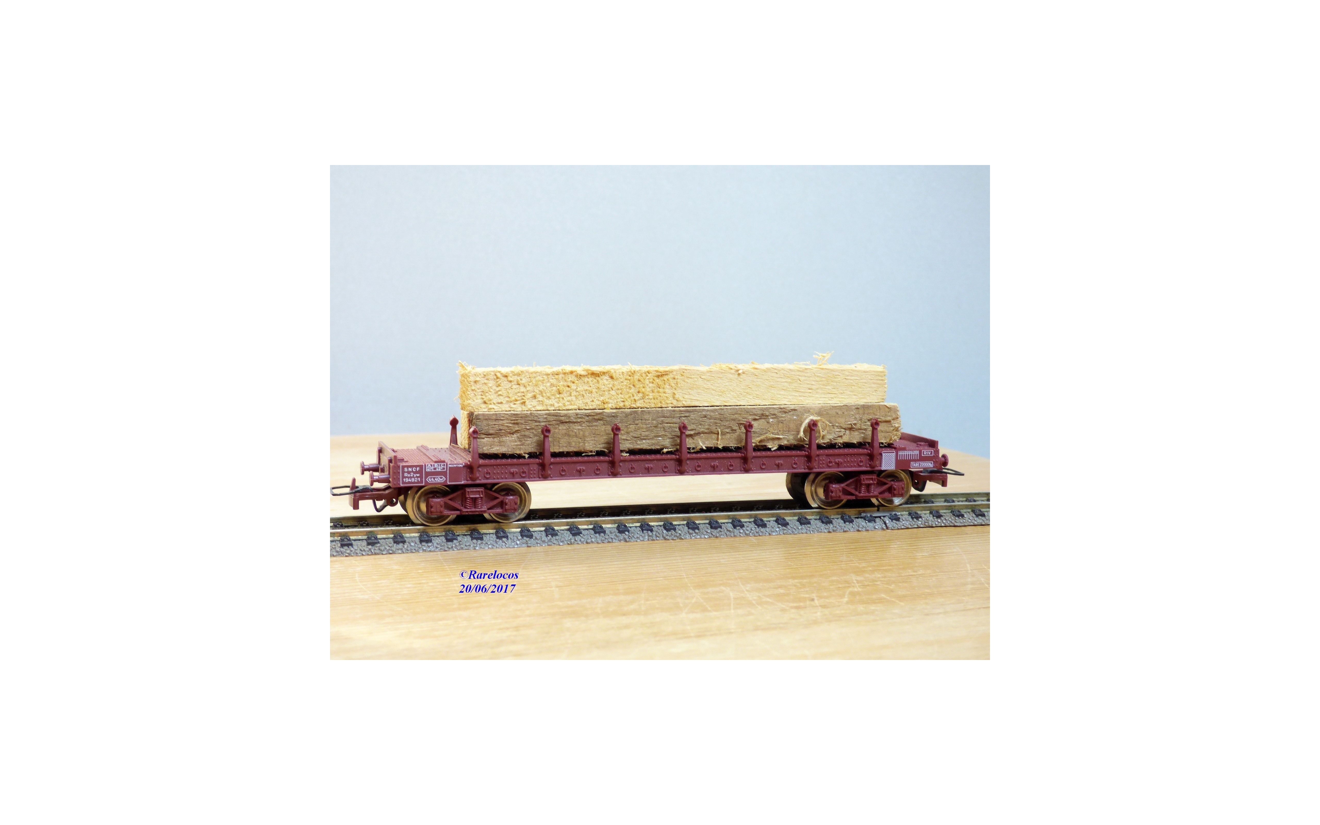 Wagon plat à ranchers à 2 bogies type Ro2yw des chemins de fer français ( SNCF ), chargé de poutres en bois ( véritable mais probablement pas d' origine ), livrée marron, boîte d'origine en excellent état.