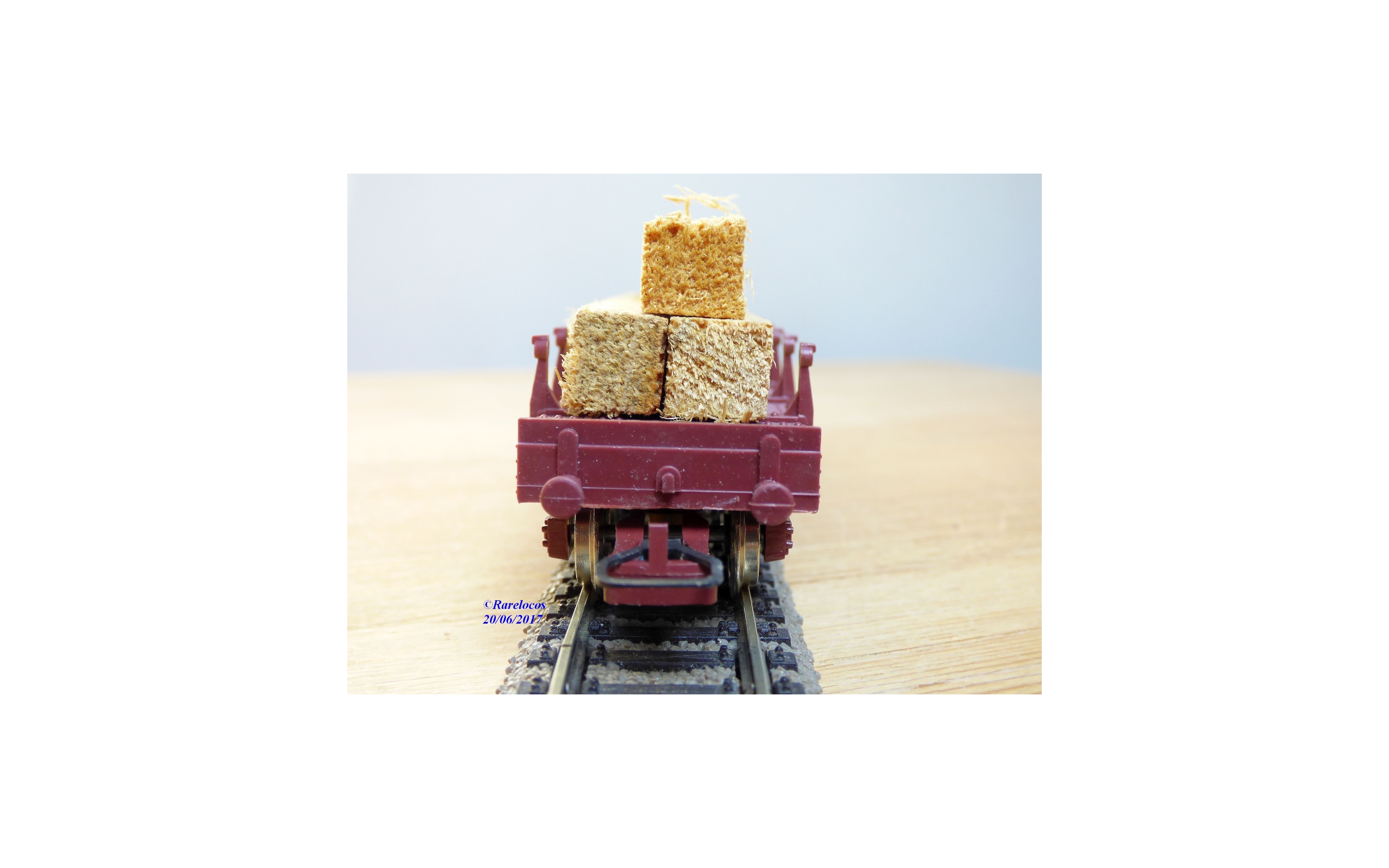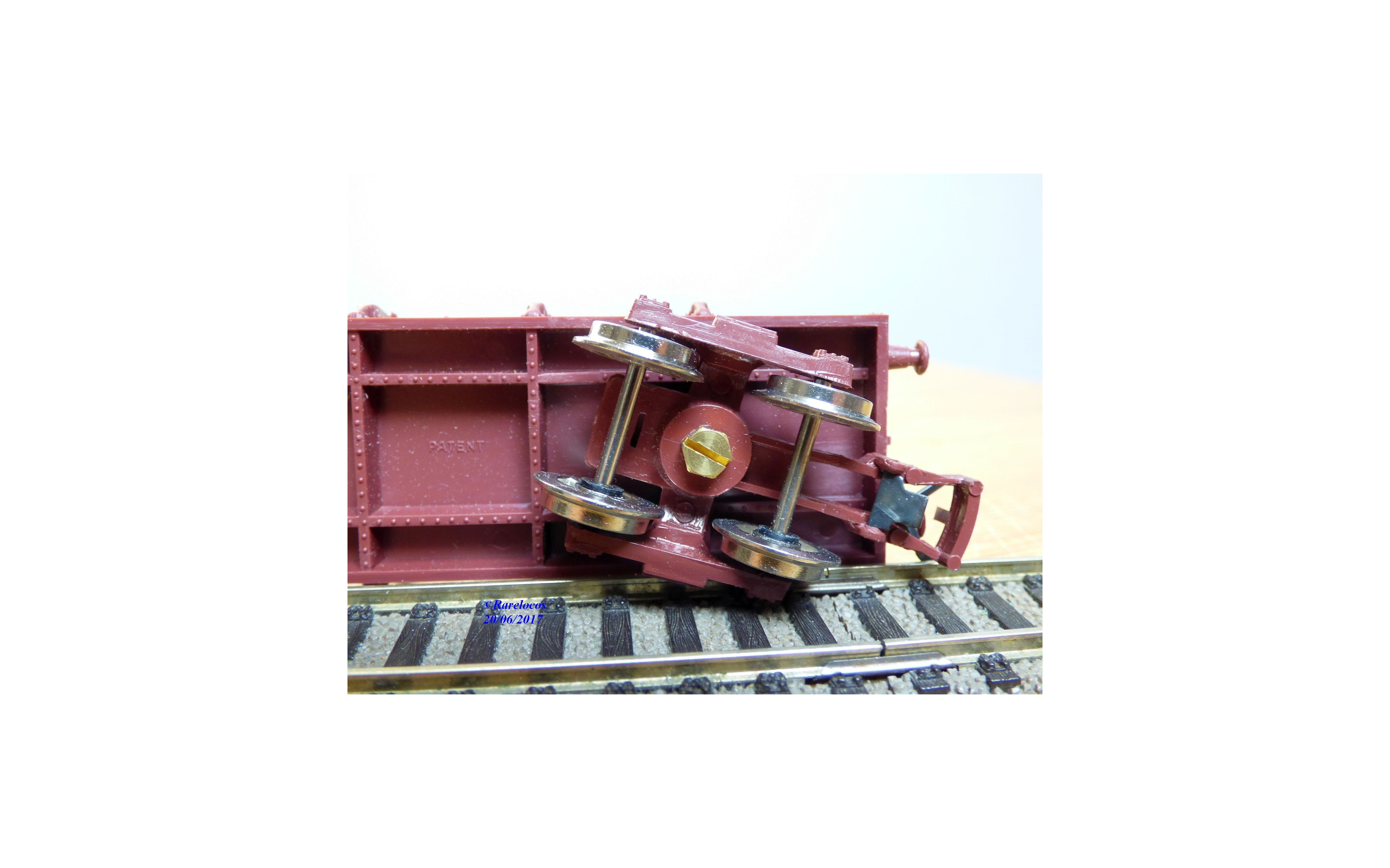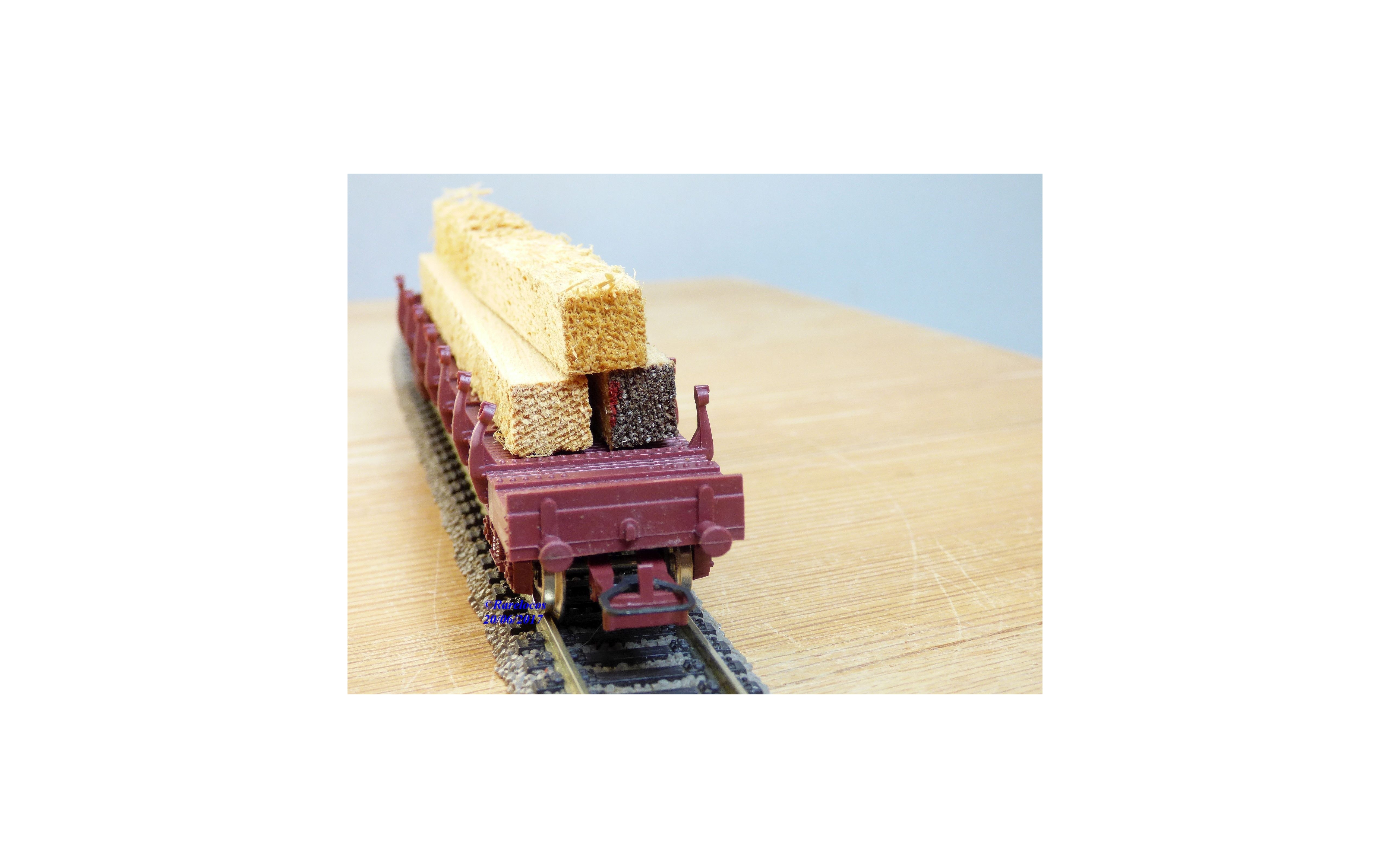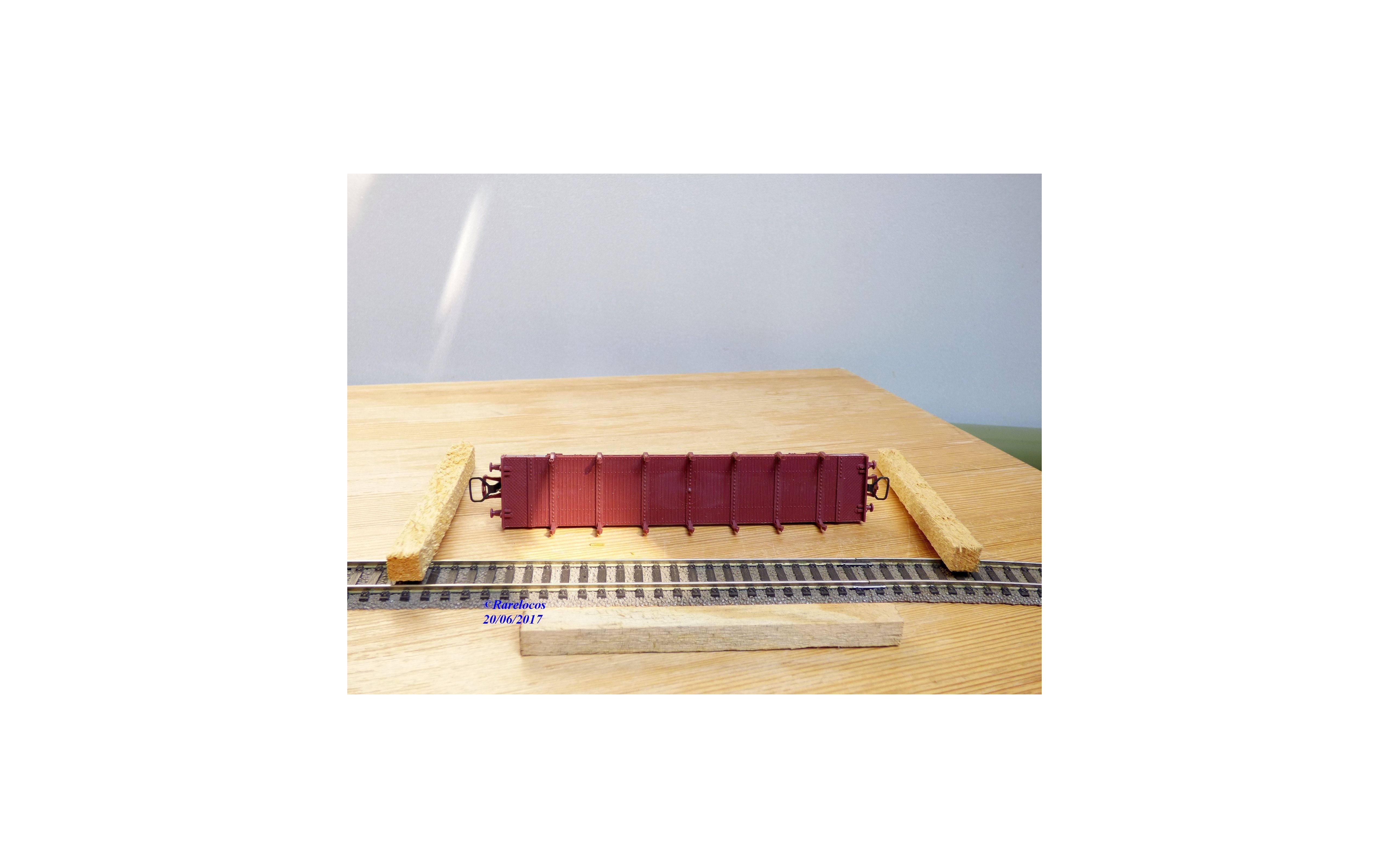 Wagon plat à ranchers à 2 bogies type Ro2yw des chemins de fer français ( SNCF ), chargé de poutres en bois ( véritable mais probablement pas d' origine ), livrée marron, boîte d'origine en excellent état.