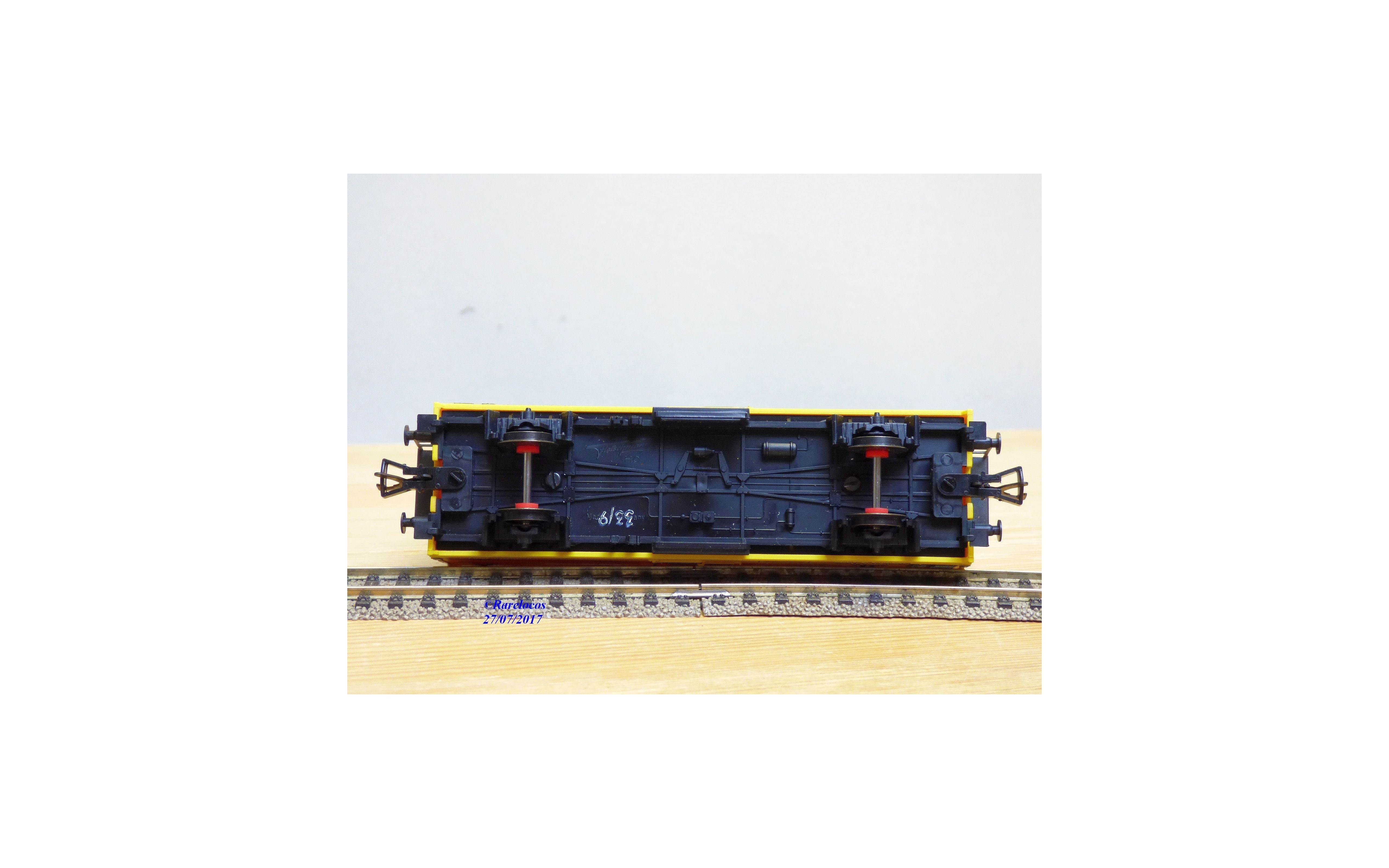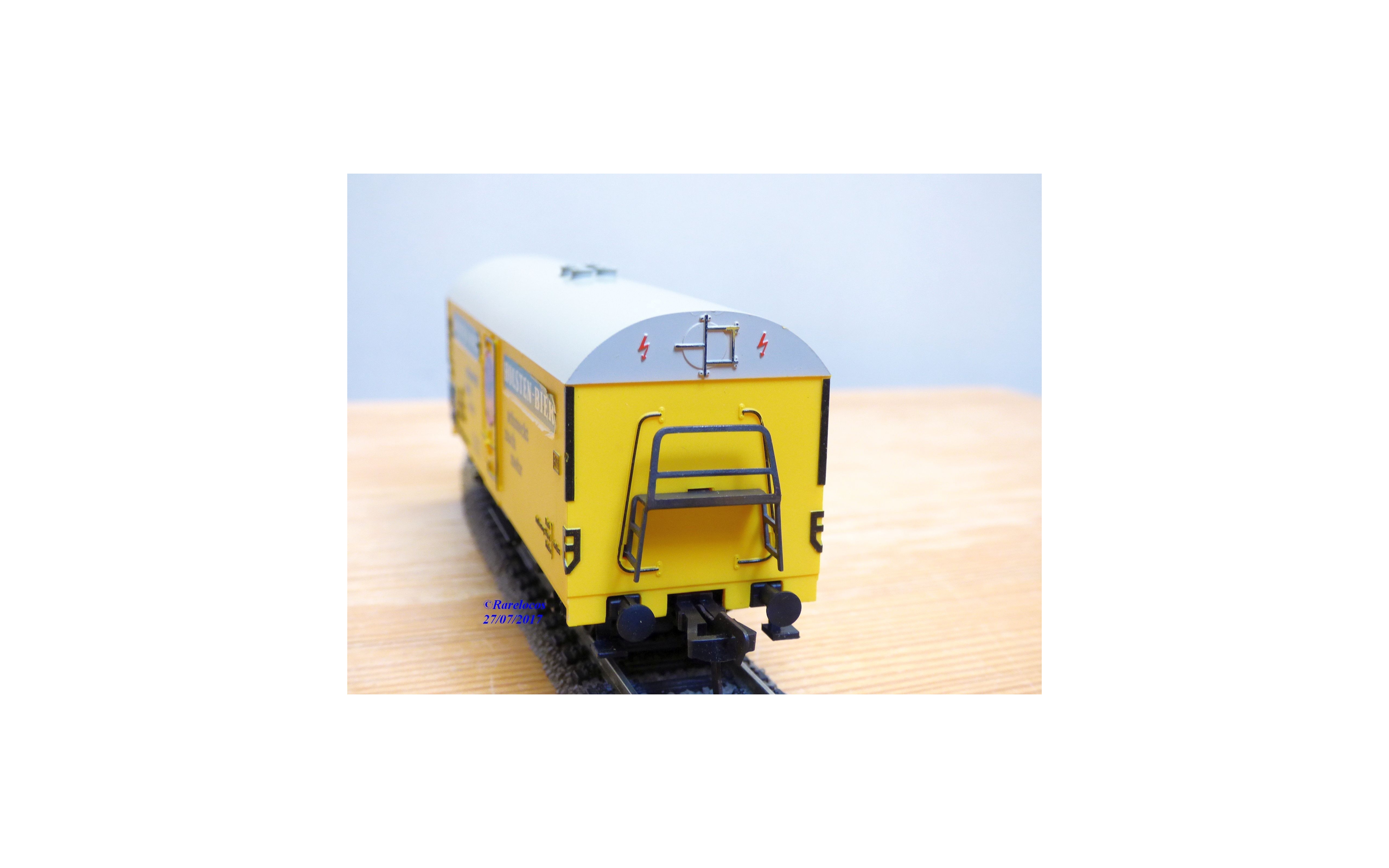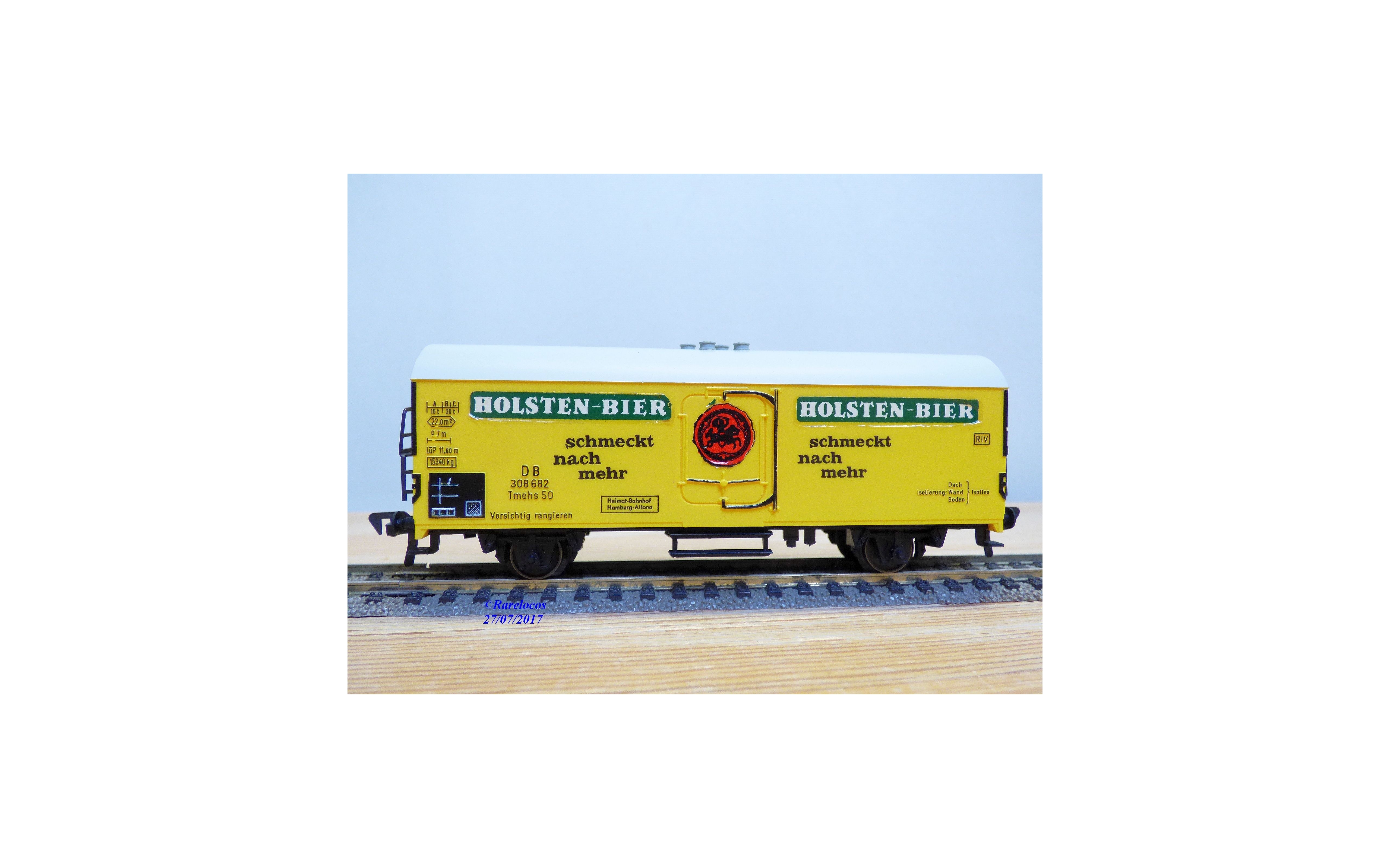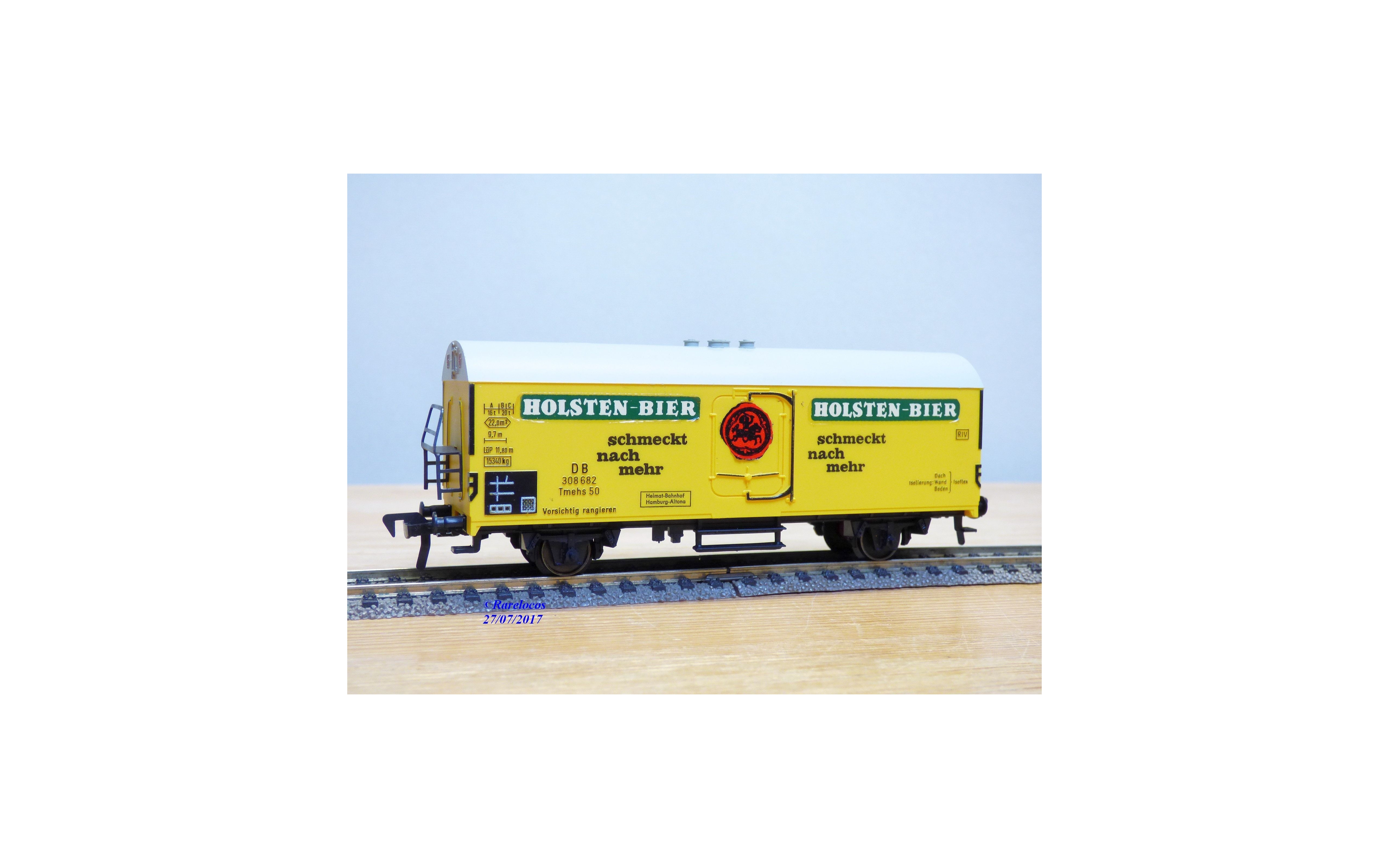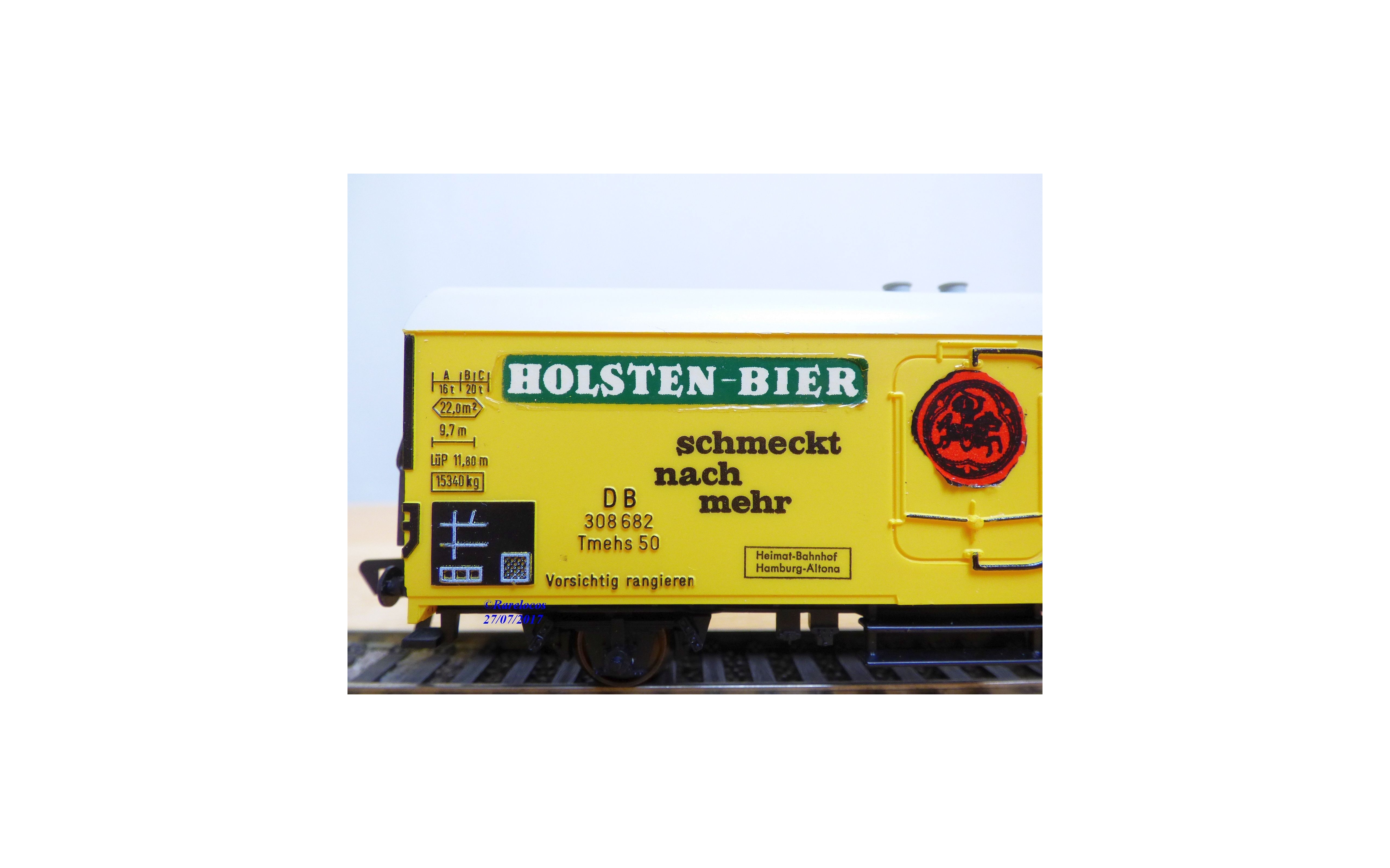 Wagon couvert réfrigérant à 2 essieux type Tmehs 50 des chemins de fer allemands ( DB ), voyante livrée jaune vif avec marquages HOLSTEN-BIER, immatriculation :308 682, boîte d'origine "coins piquants".