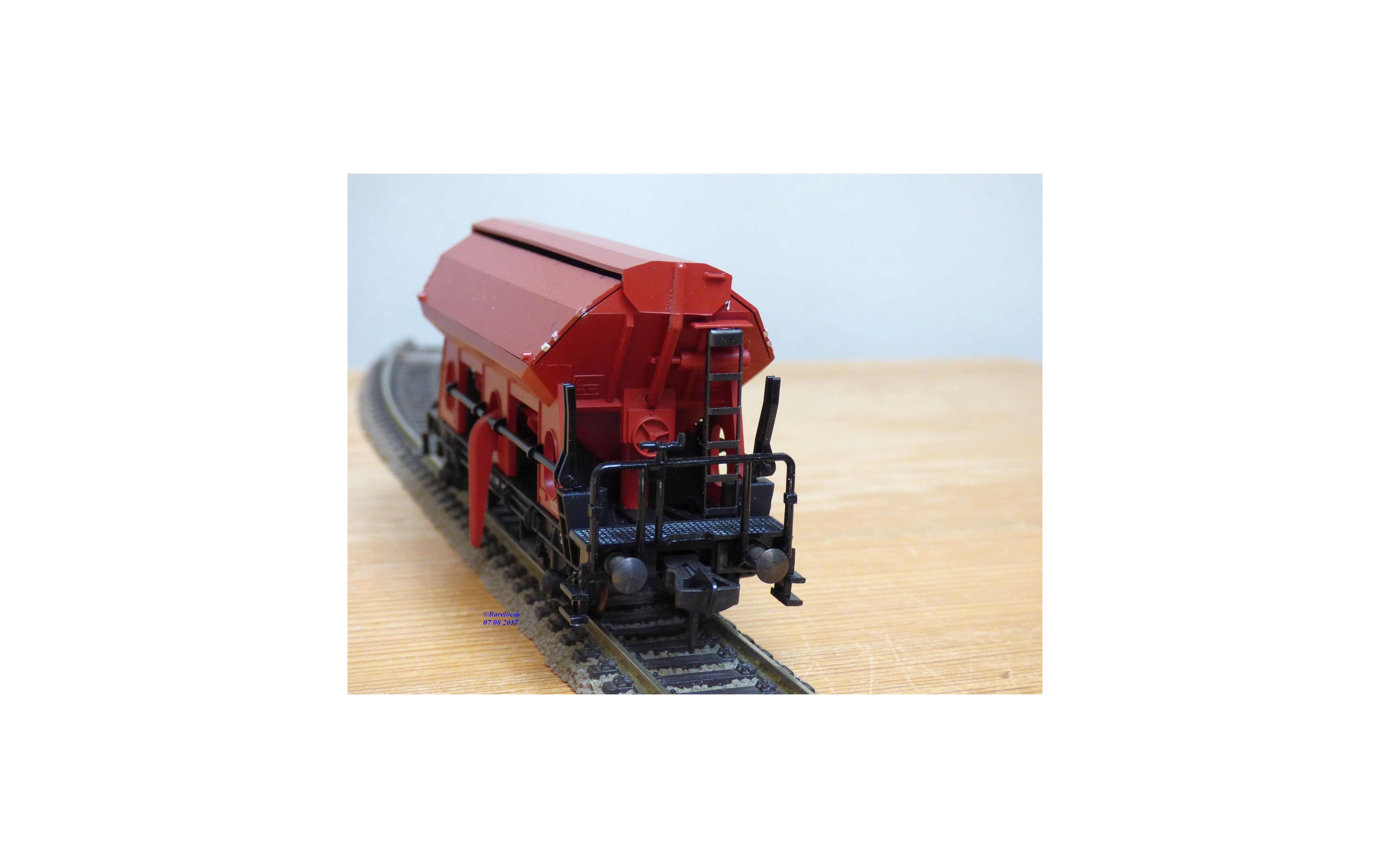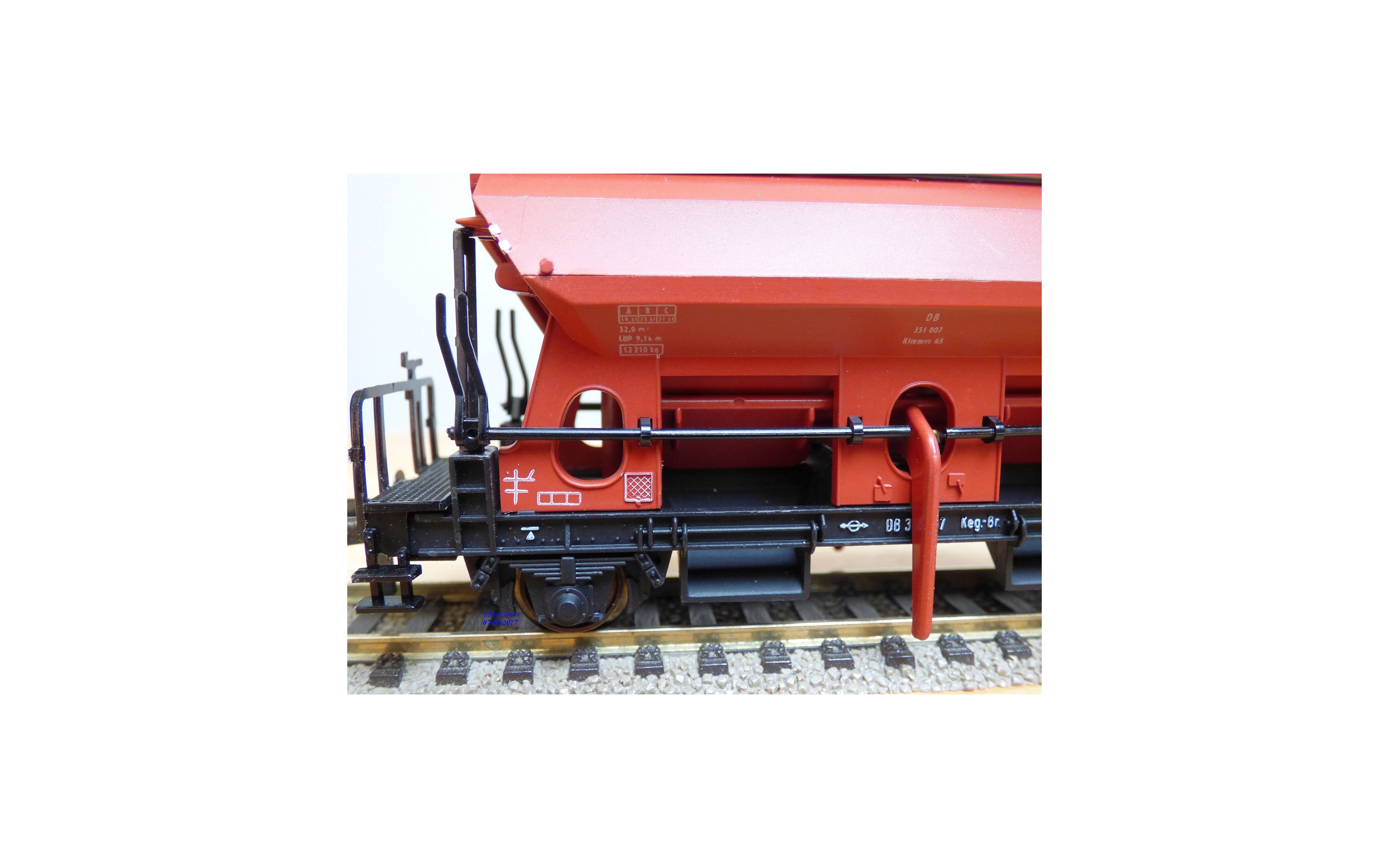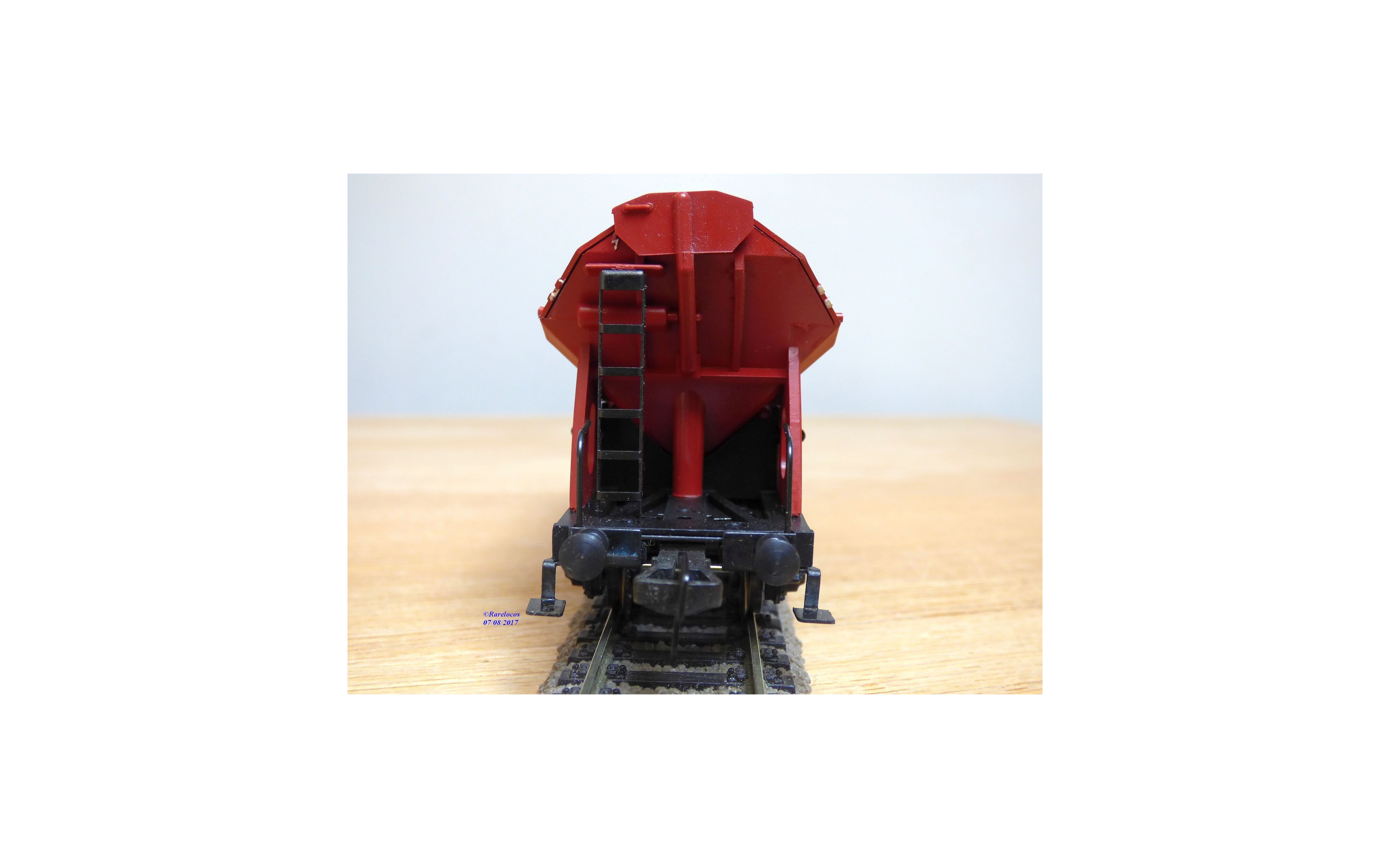 Wagon trémie à déchargement latéral ( fonctionnel ) à 2 essieux type Ktmms 65 des chemins de fer allemands (DB), boîte d'origine " coins piquants " .