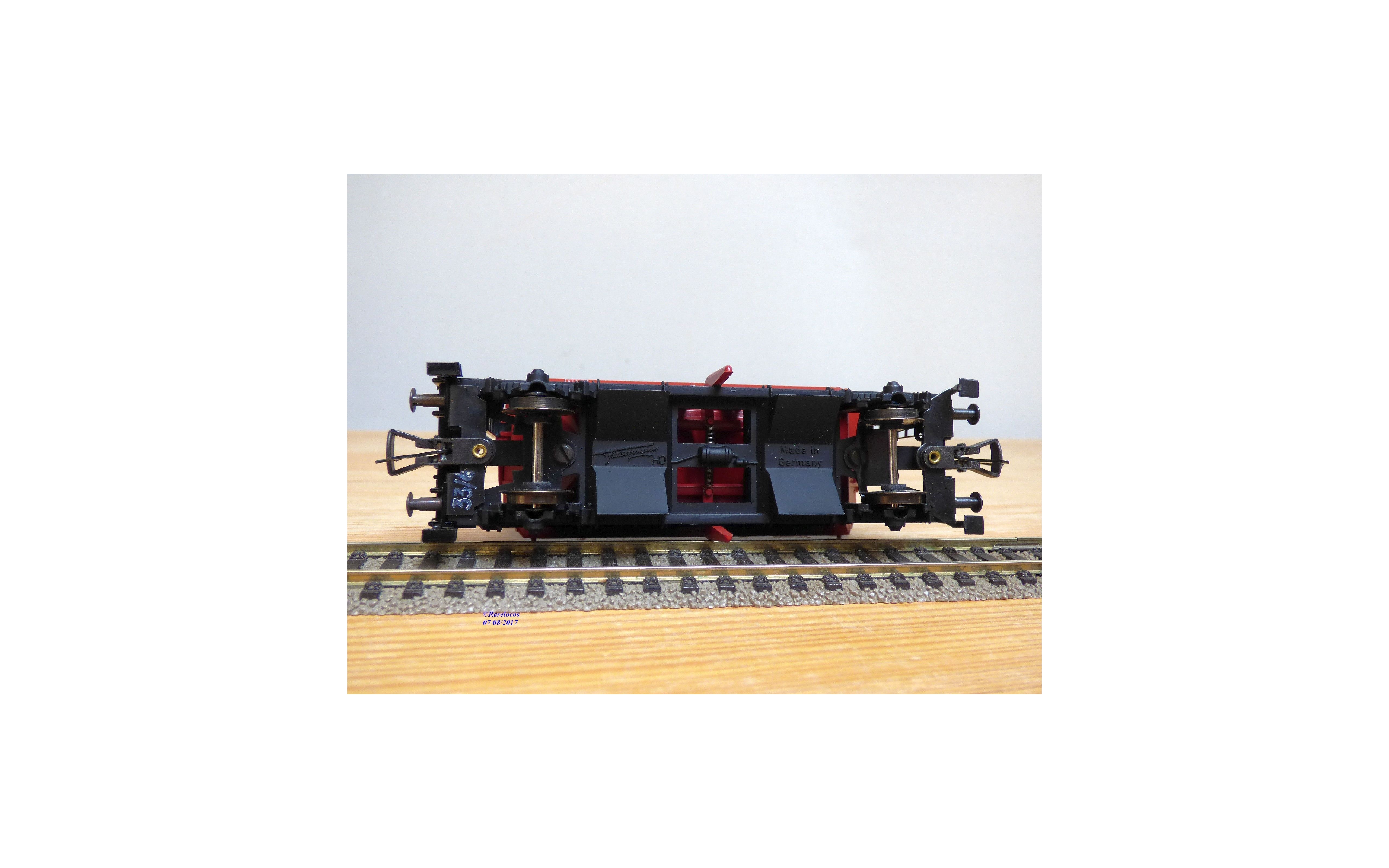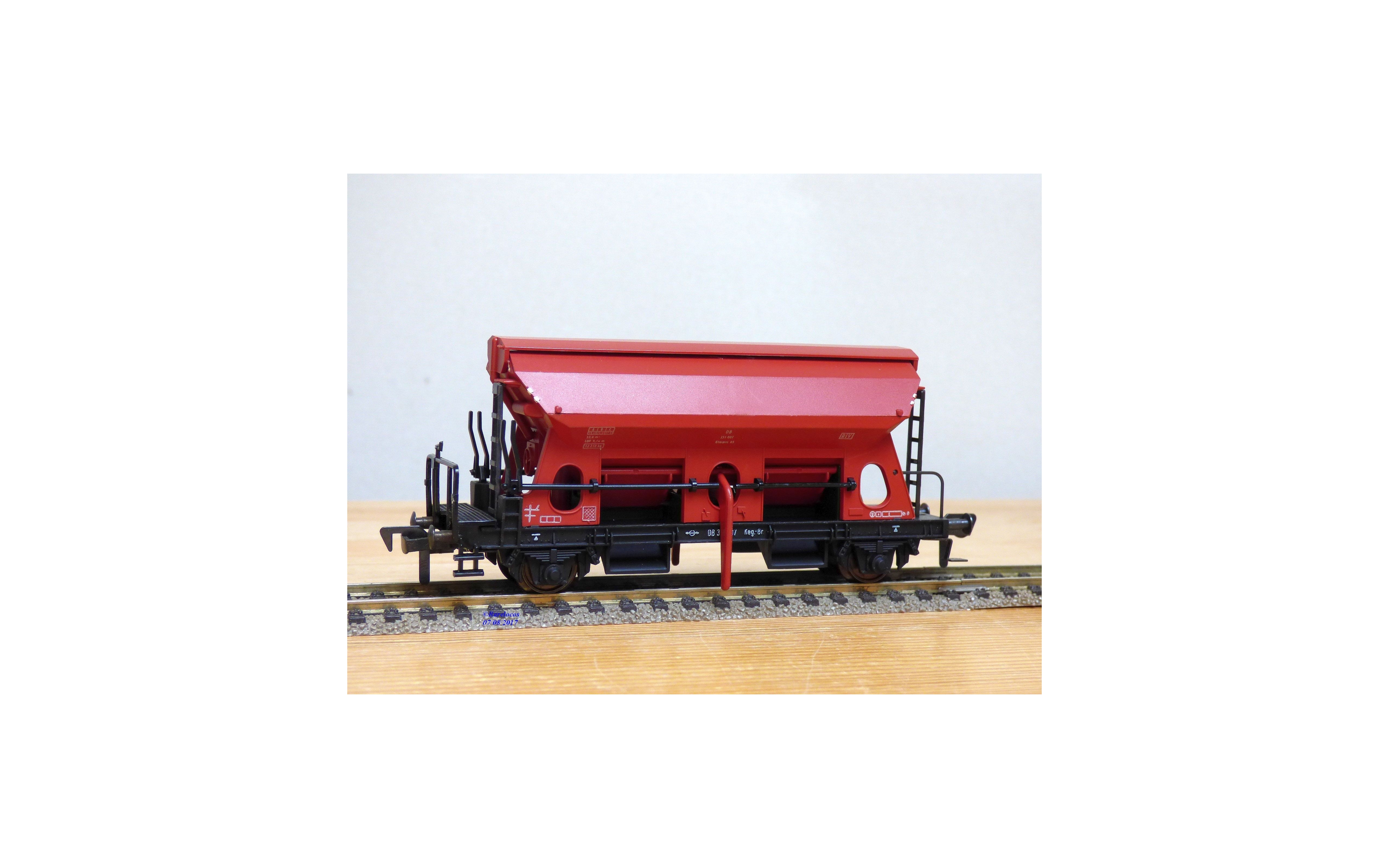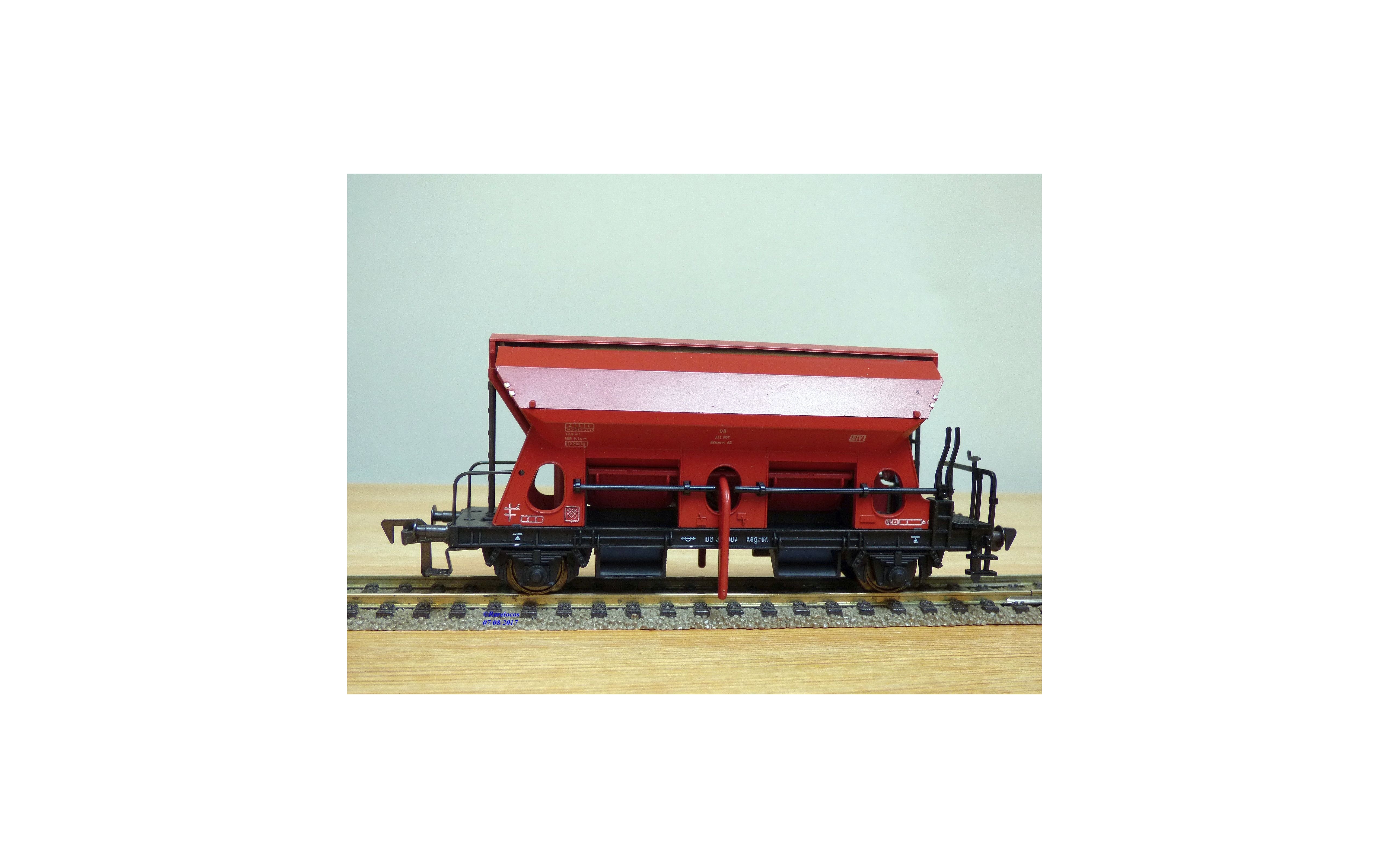 Wagon trémie à déchargement latéral ( fonctionnel ) à 2 essieux type Ktmms 65 des chemins de fer allemands (DB), boîte d'origine " coins piquants " .