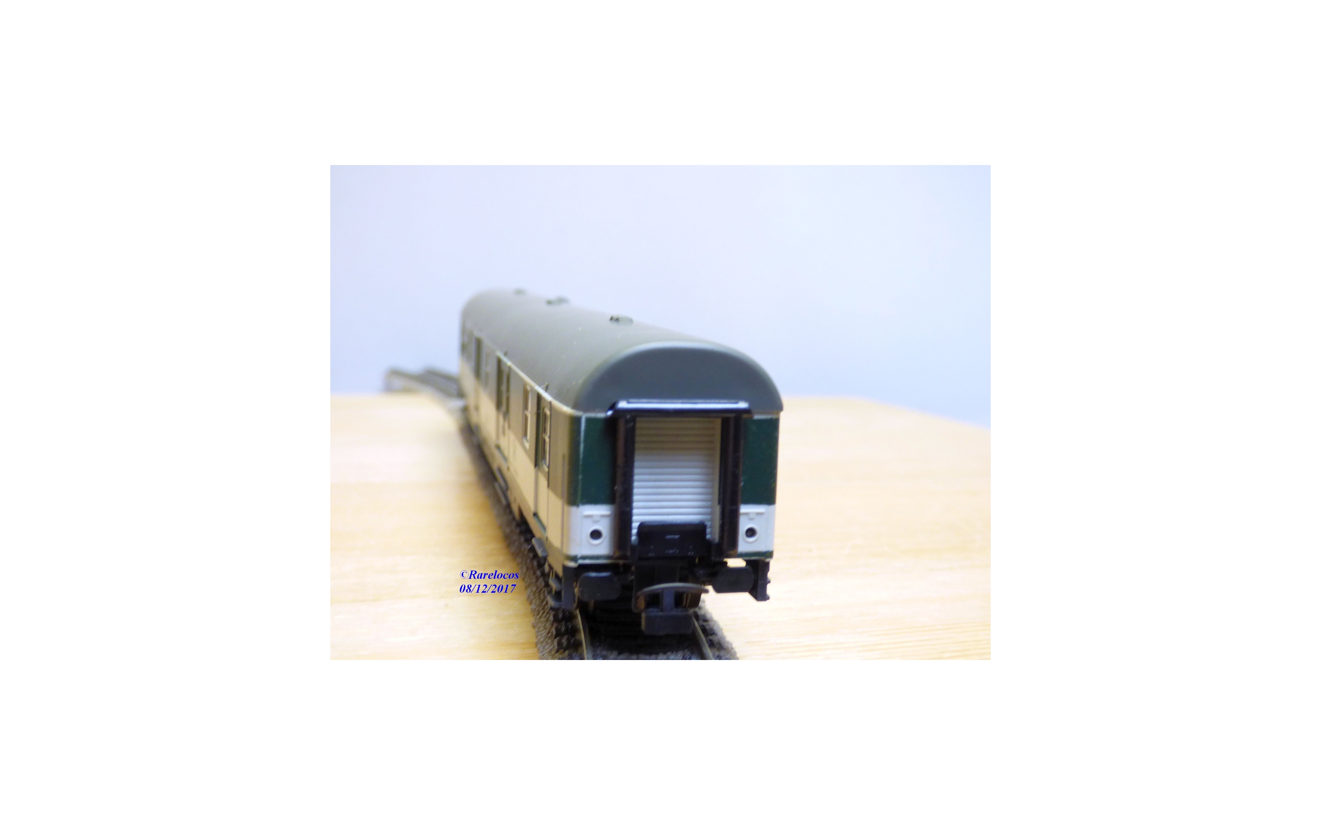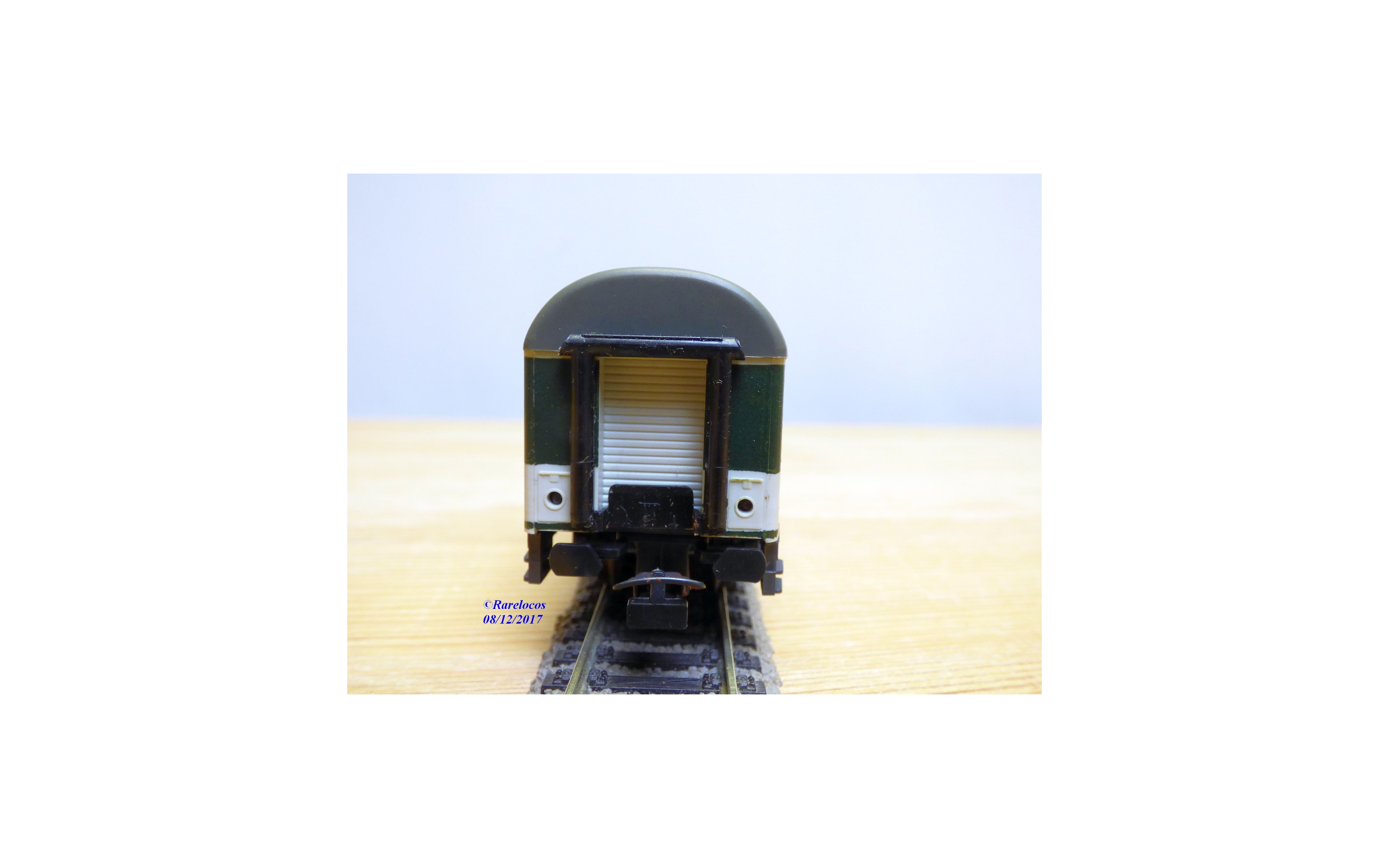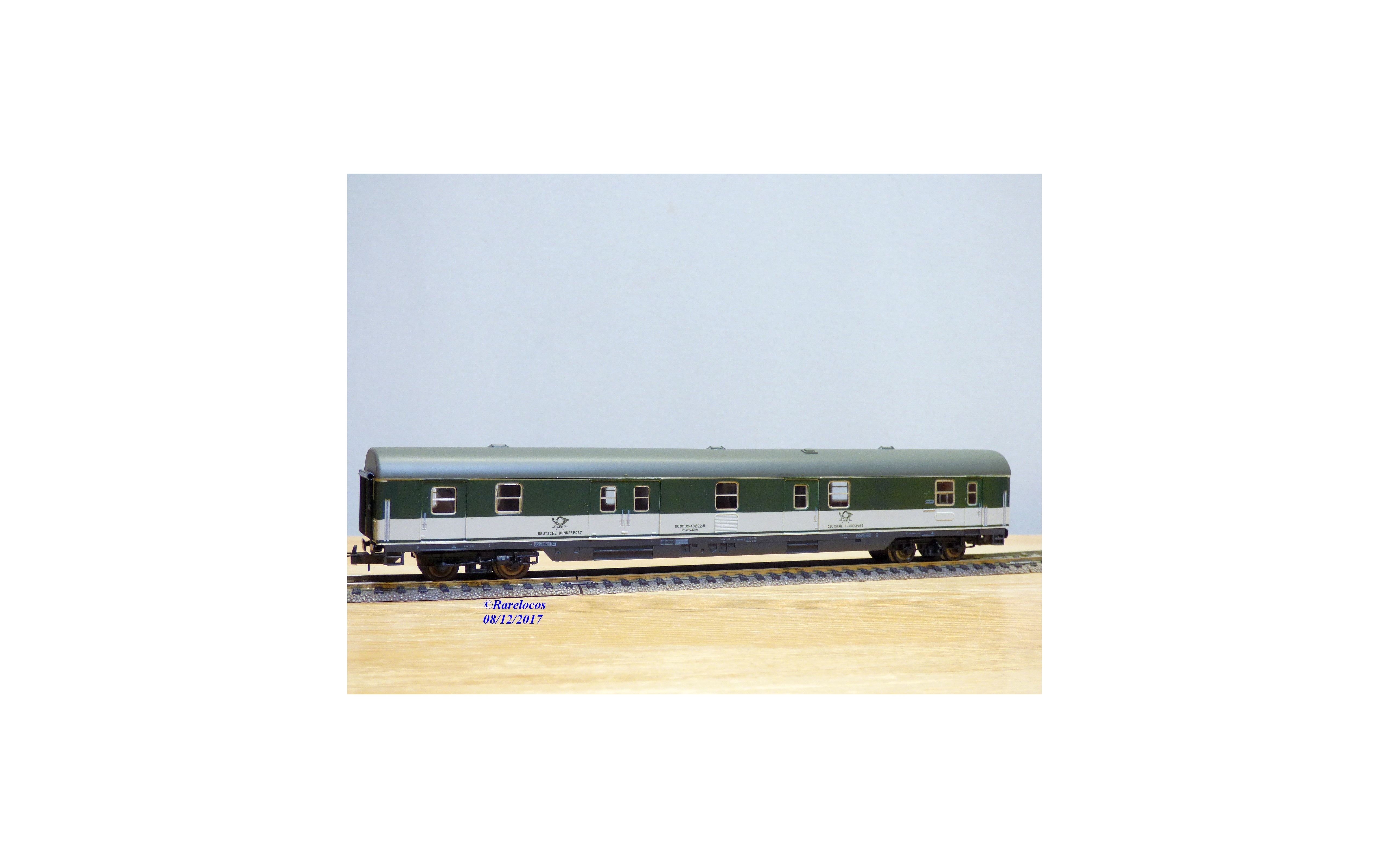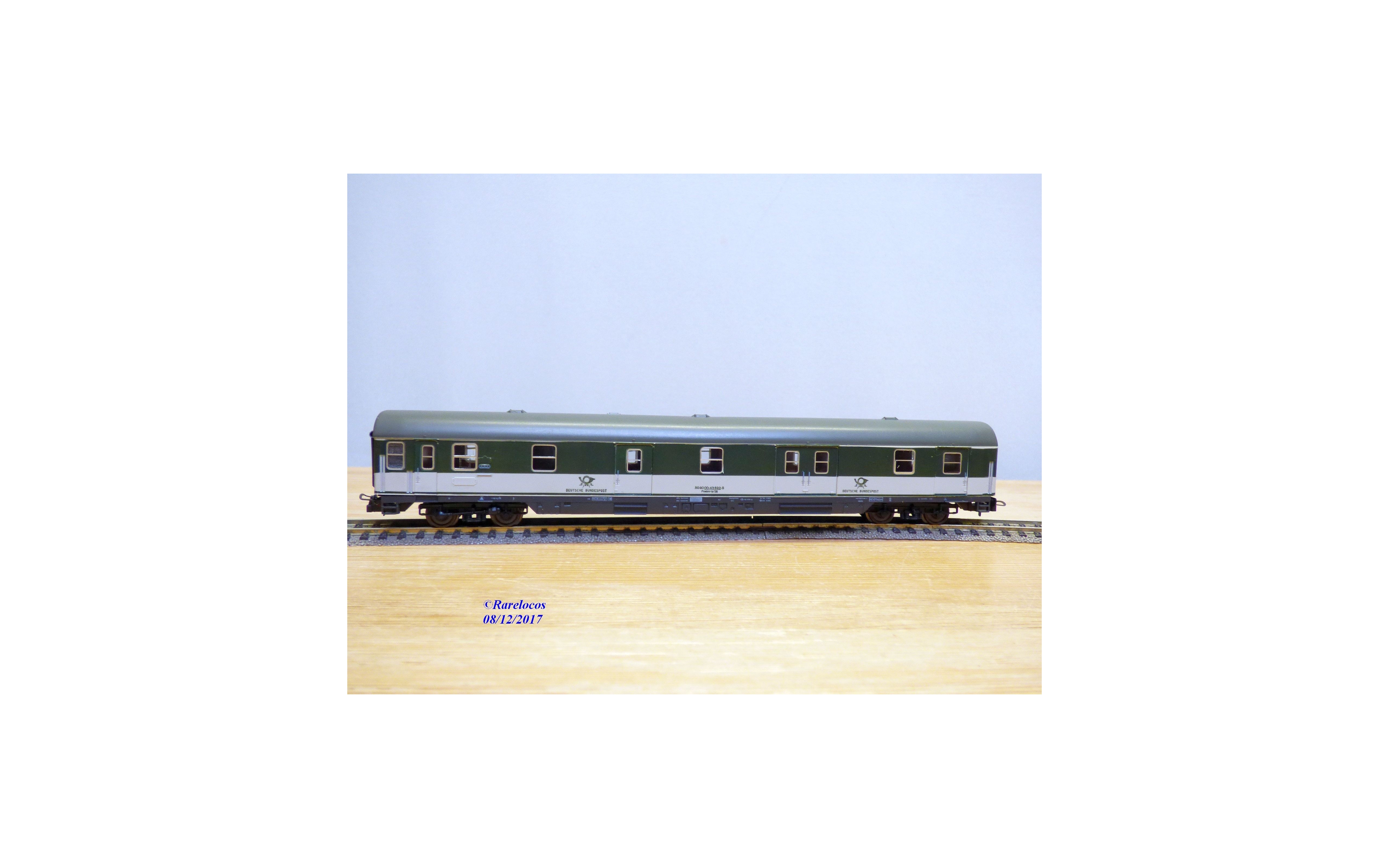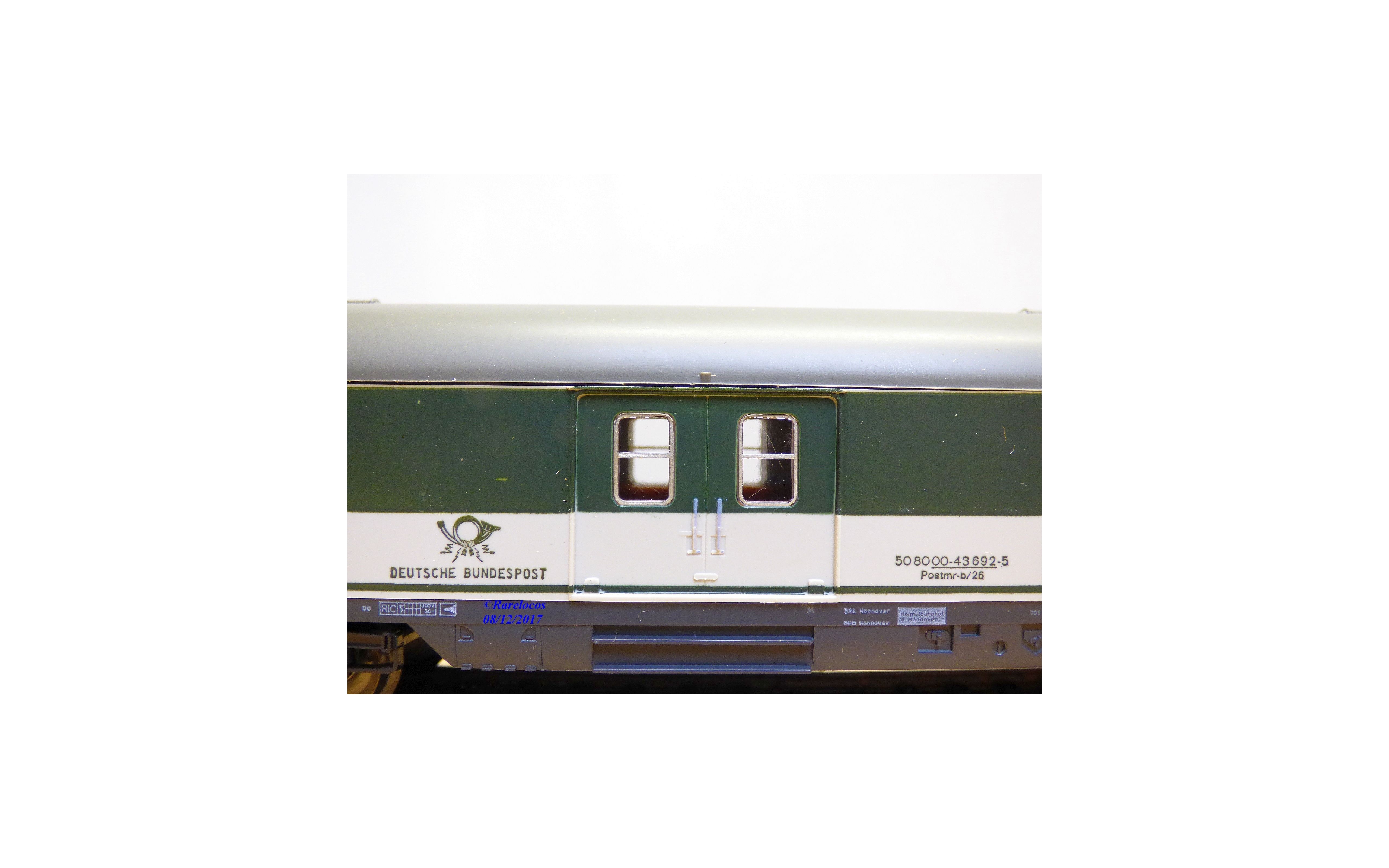 Fourgon postal grandes lignes à 2 bogies type Postmr-b / 26 des chemins de fer allemands ( DB ), livrée verte et blanche à toit gris, plaques d'itinéraires intactes, boîte d'origine en très bon état.
