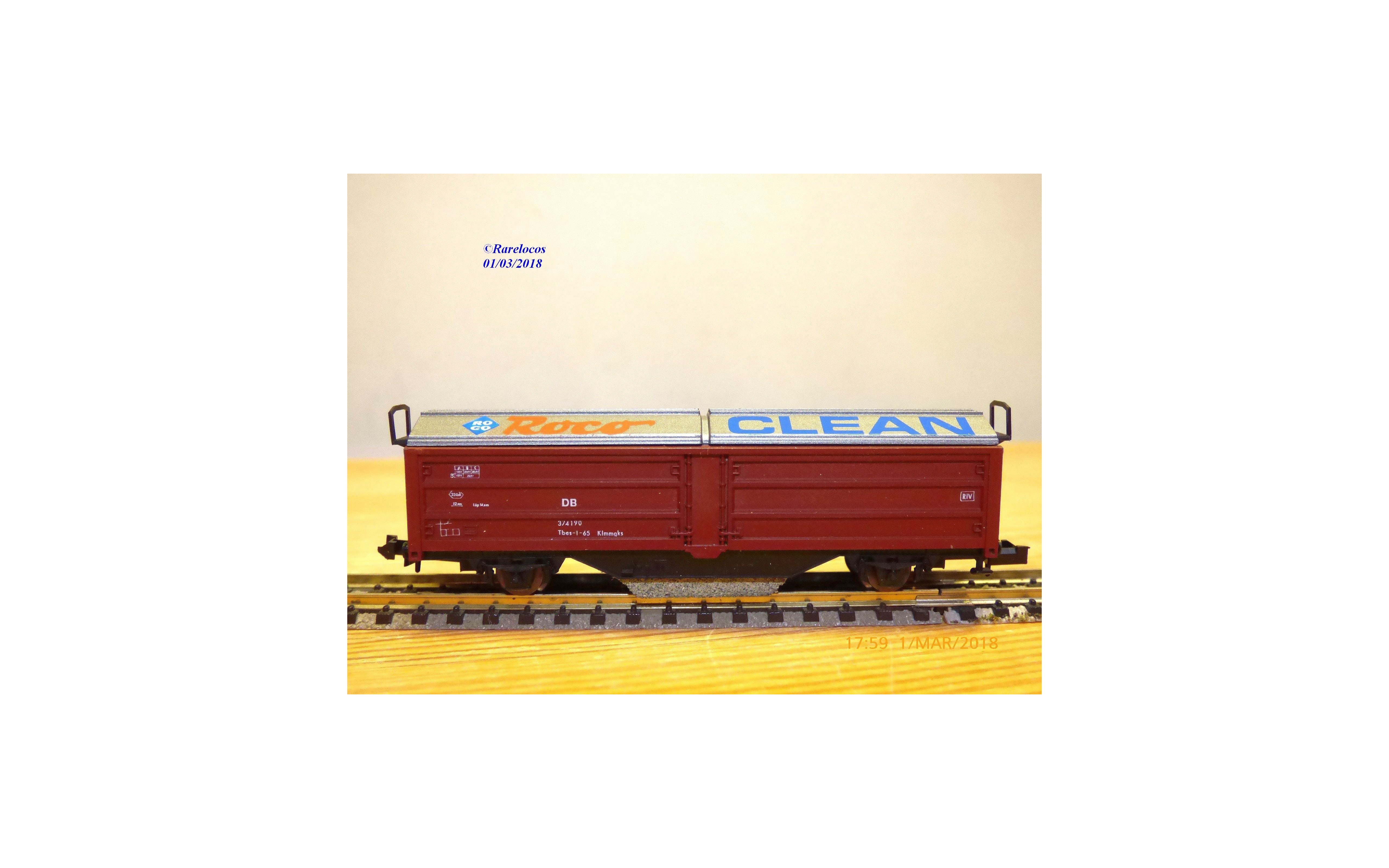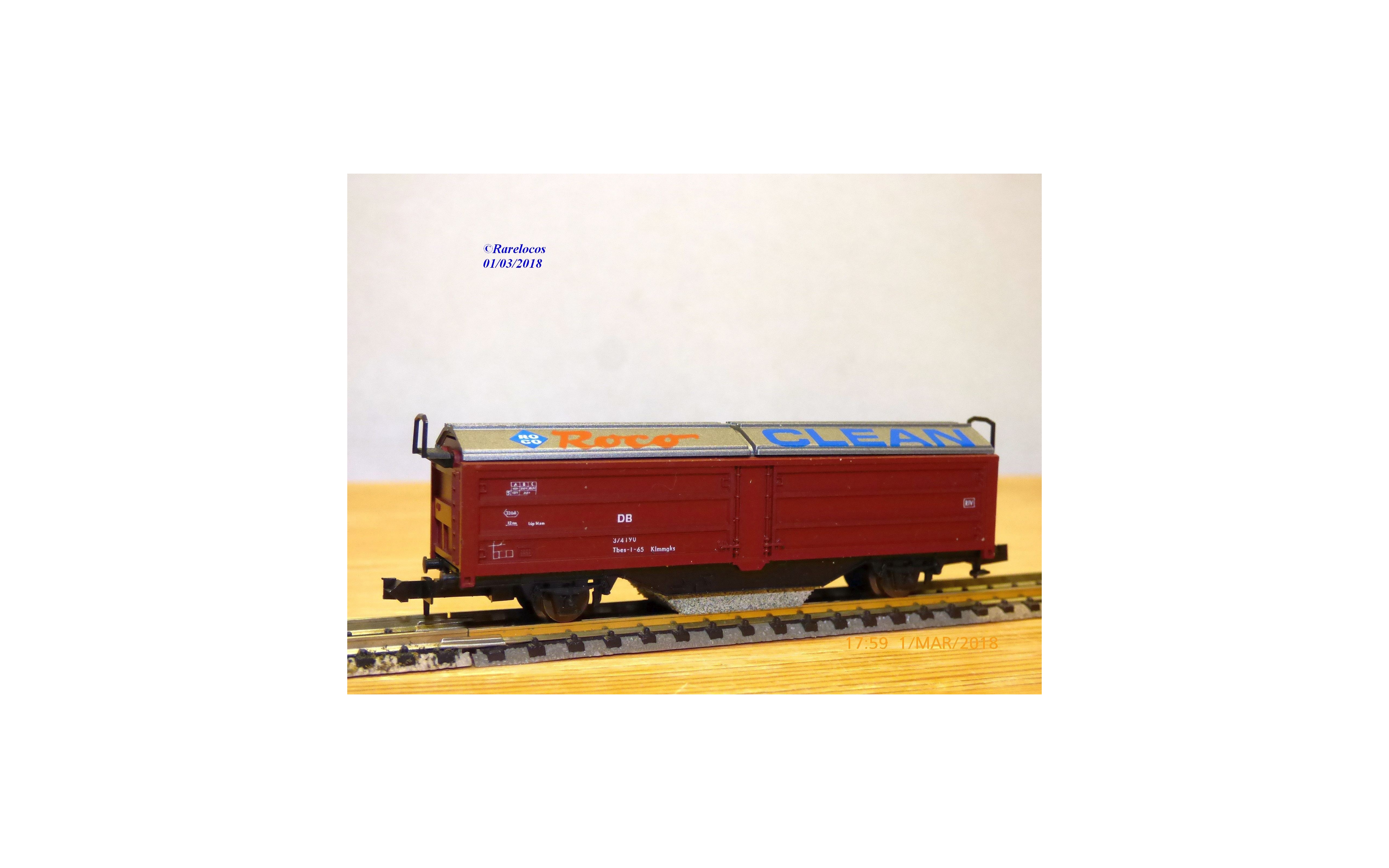 Wagon nettoyeur de voies à toits coulissants à 2 essieux type Klmmgks des chemins de fer allemands ( DB ), livrée marron à toit gris avec marquages ROCO Clean, immatriculation:3/4190, boîte d'origine en bon état.