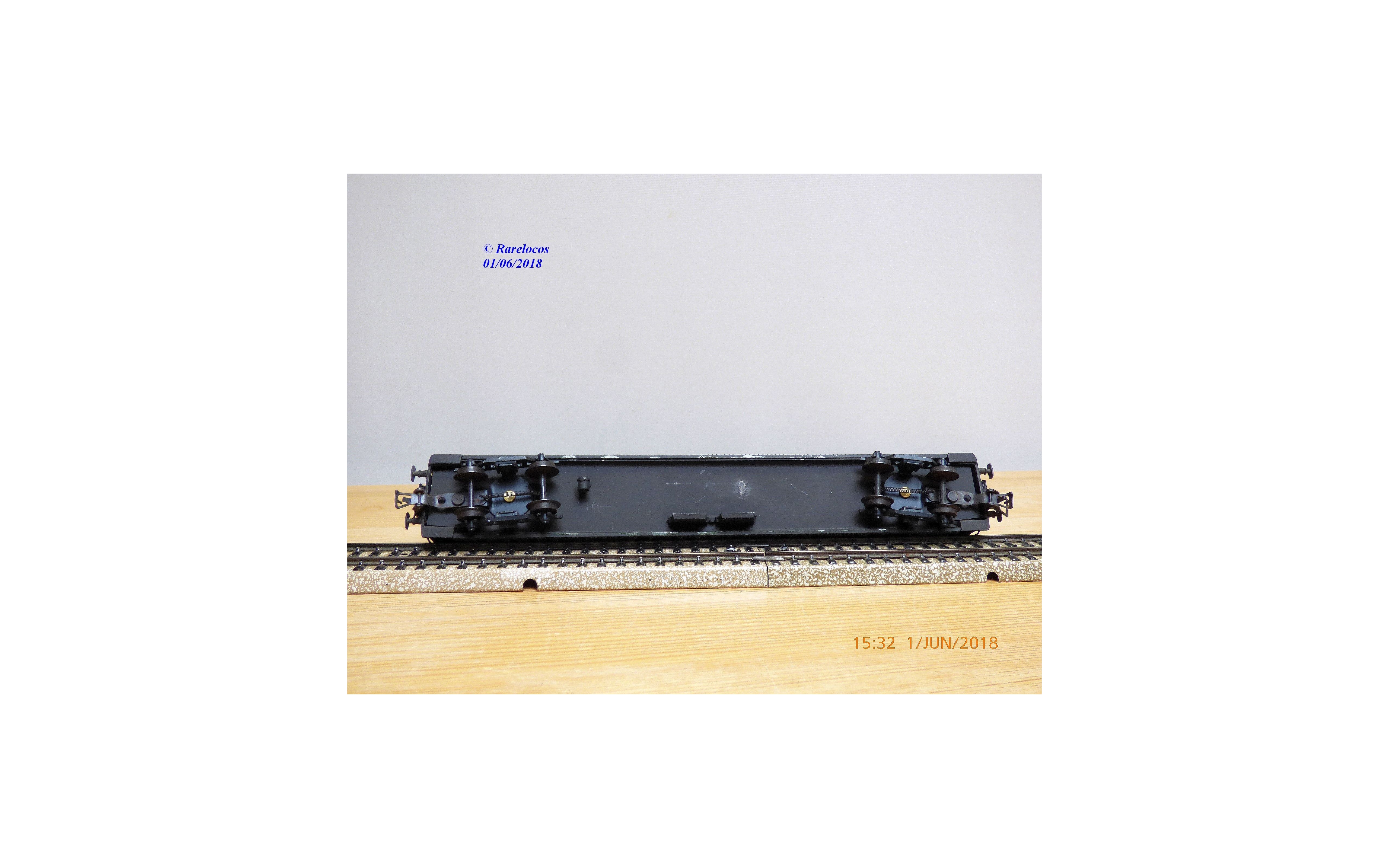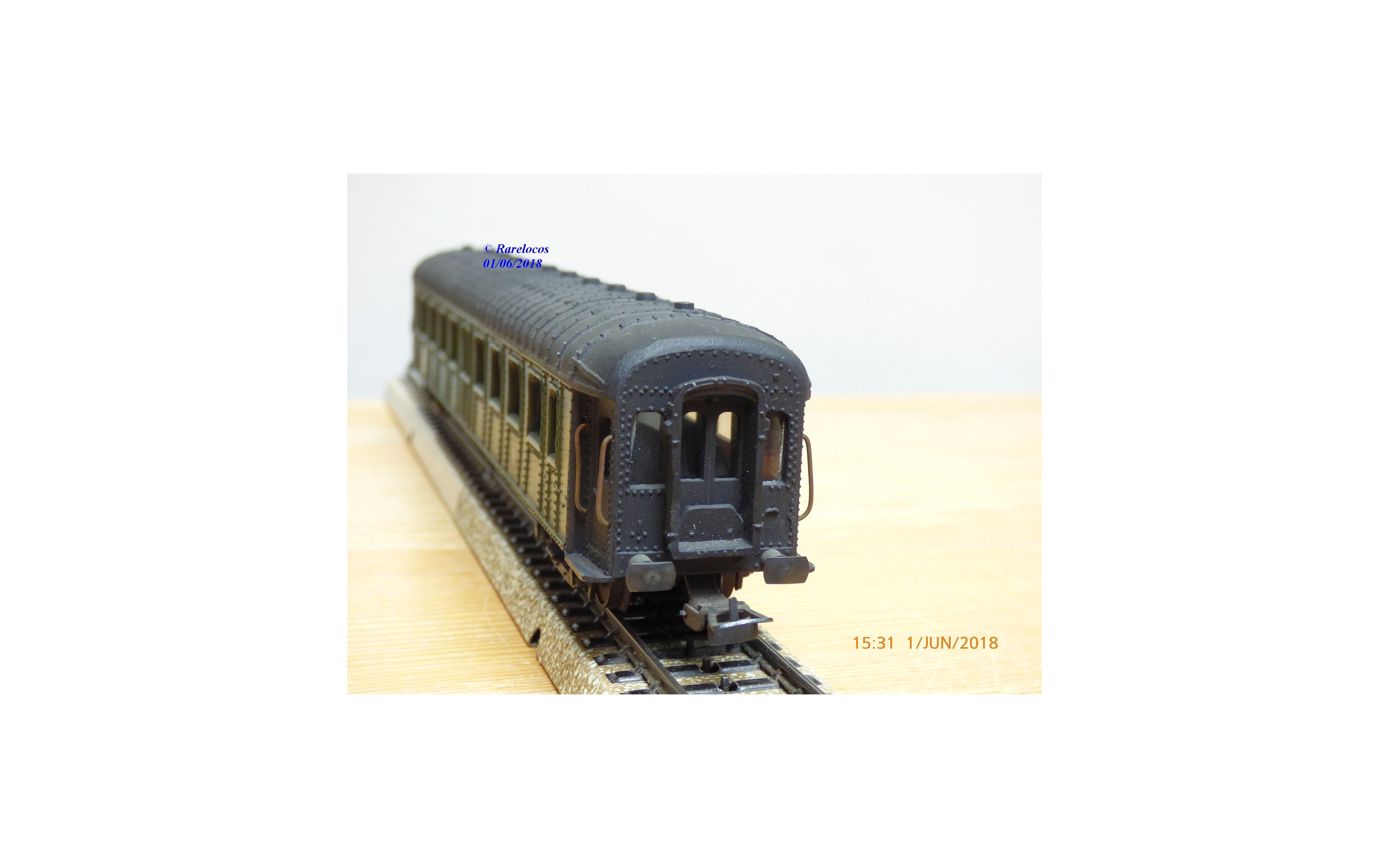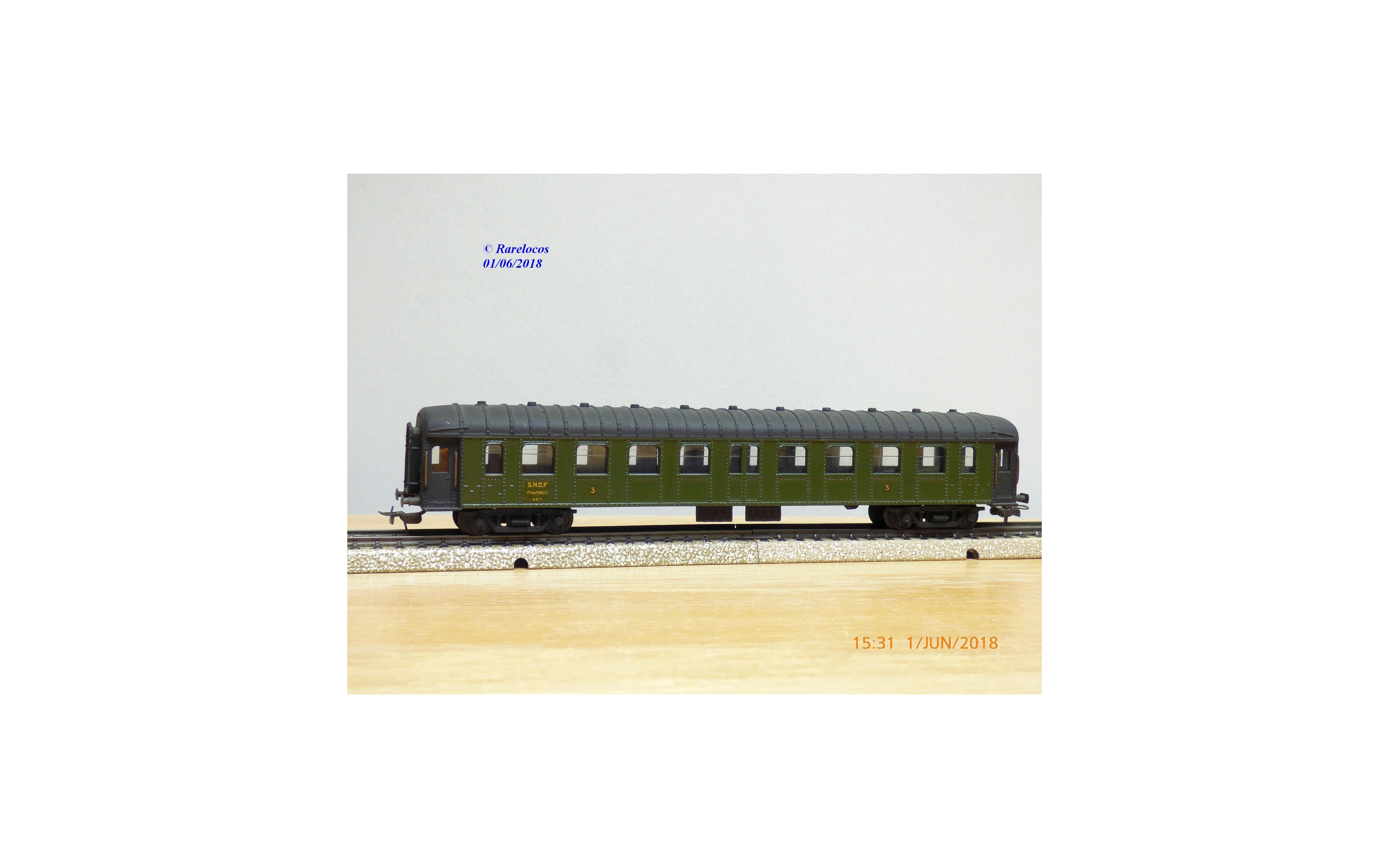 Voiture grandes lignes OCEM à rivets de 3 ème classe des chemins de fer français ( SNCF ), tout en métal, livrée verte à toit noir, immatriculation :C9 myfi 54672, pas de boîte d'origine