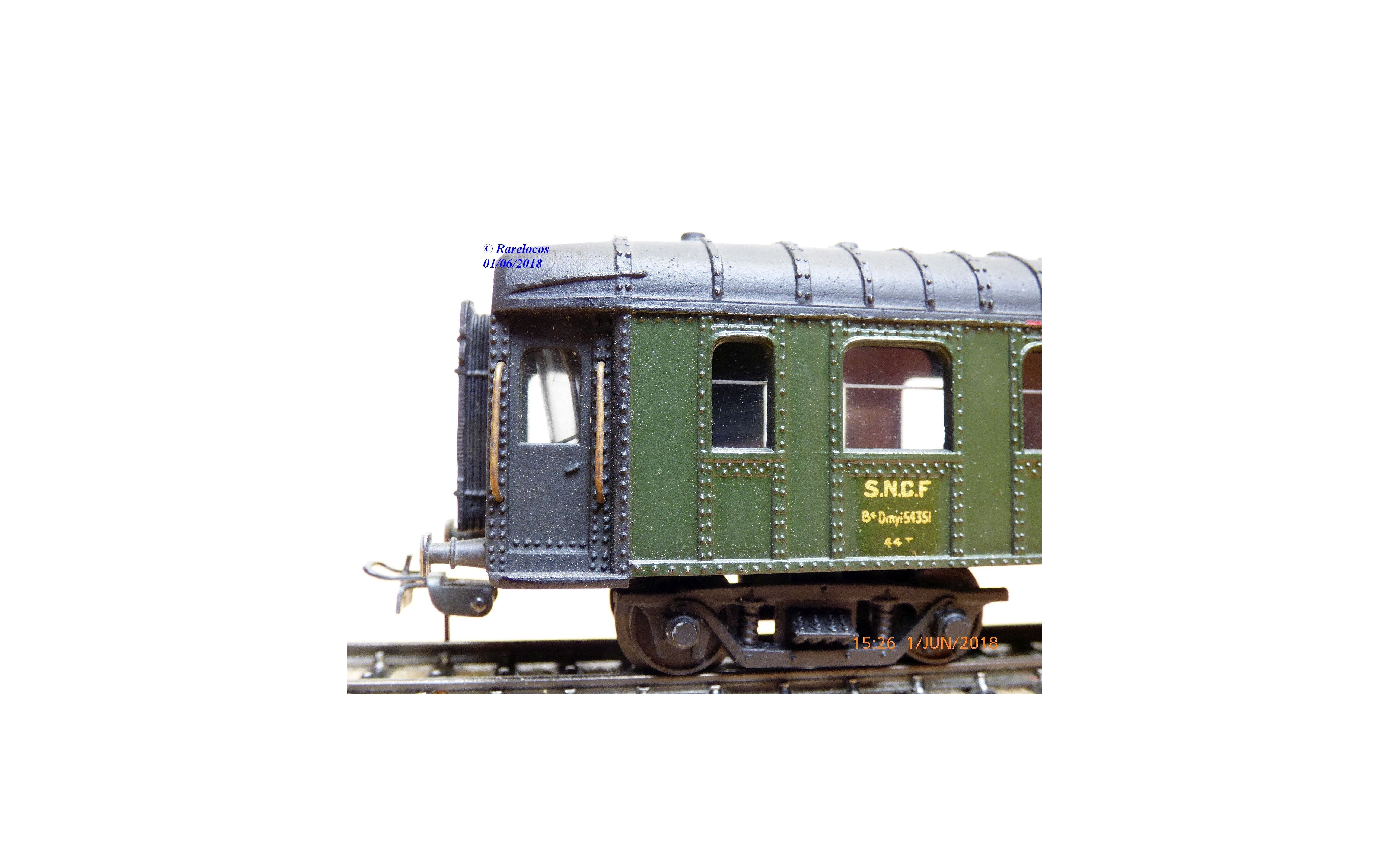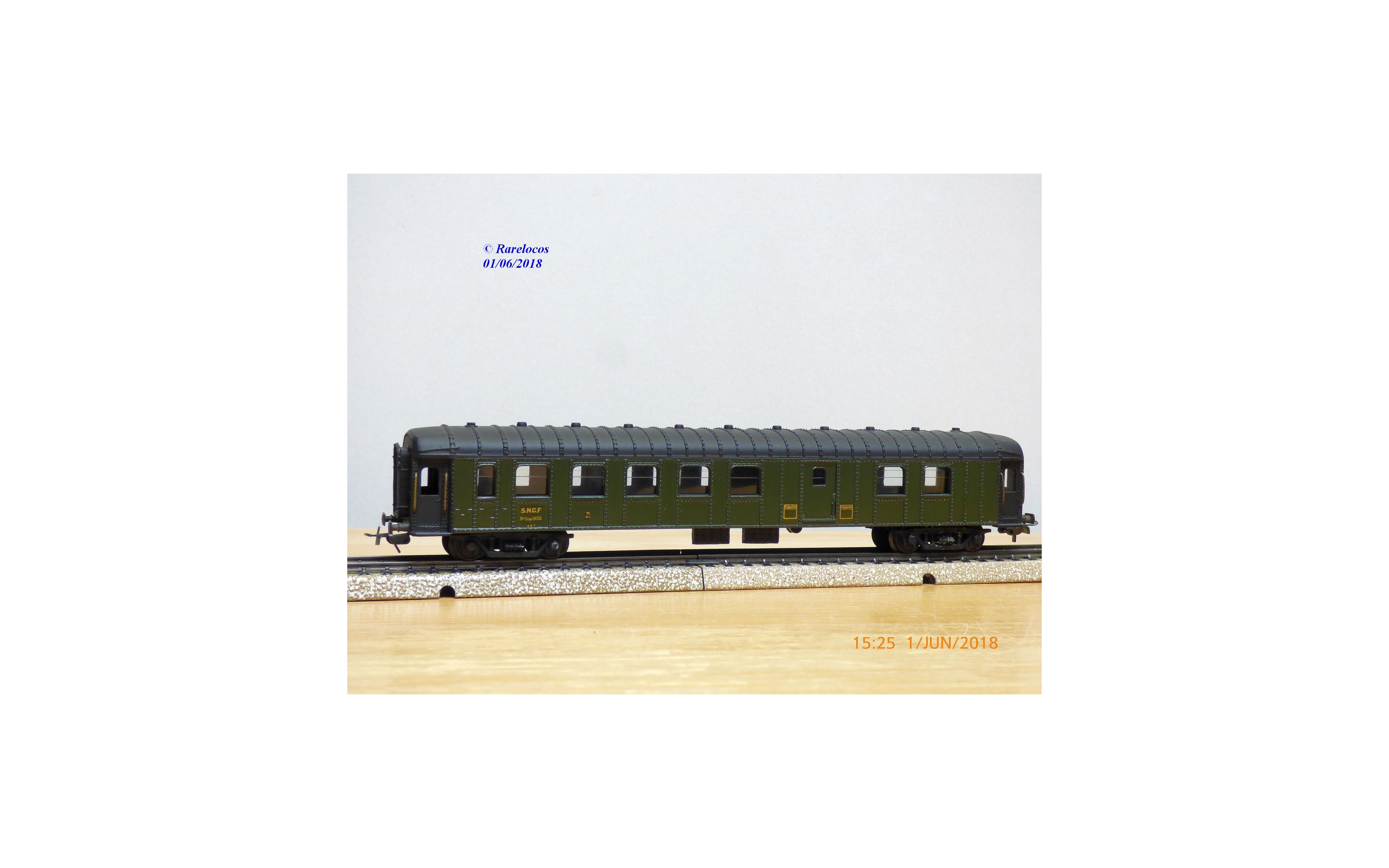 Voiture grandes lignes OCEM à rivets mixte de 2 ème classe et fourgon des chemins de fer français ( SNCF ), tout en métal, livrée verte à toit noir, immatriculation :B4D myi 54351, pas de boîte d'origine
